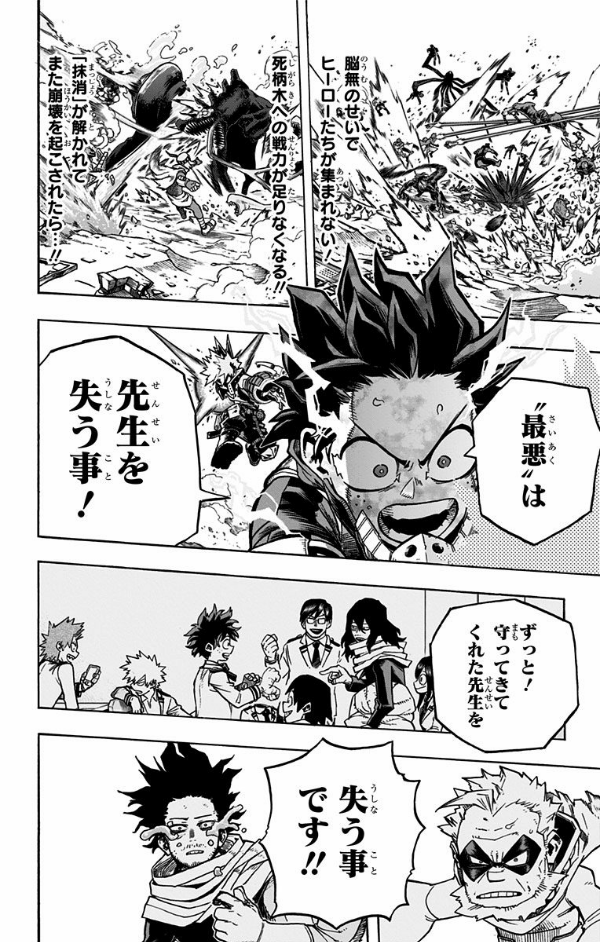 デッカい男のせいで、辺り一帯がメチャクチャ! 「主のもとへ」って、死柄木? ……ダメ! こいつが街に降りたら、ひとたまりもない! 雄英生も危険じゃない! 蛇腔病院側で何が!? い・い・か・ら、止まれぇぇええええ!! “Plus Ultra”!!