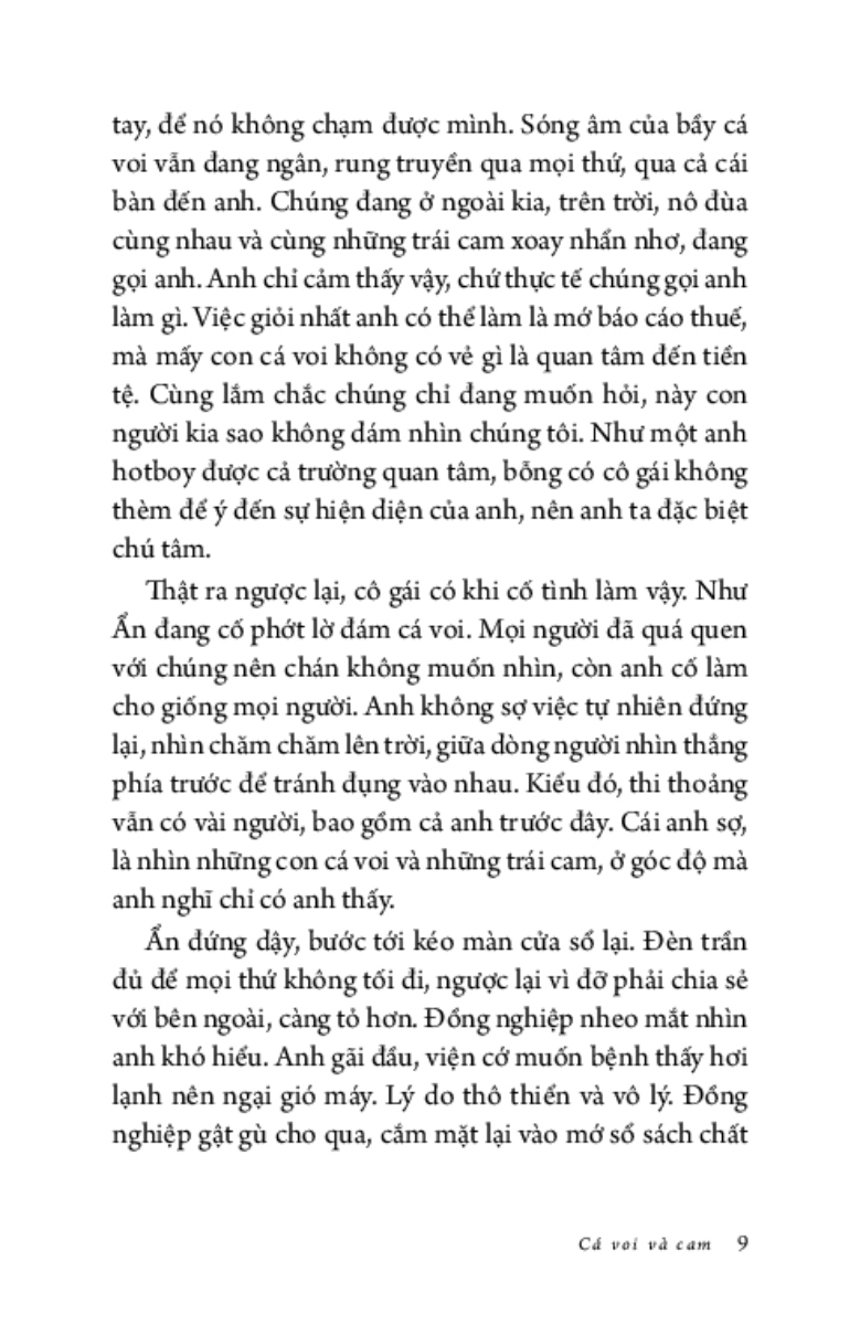 Ẩn không dám nhìn lên, anh chỉ muốn tránh bầu trời đẹp đẽ ấy, muốn nhanh nấp vào công ty để nhìn những trần nhà xám lạnh tẻ nhạt. Sự tẻ nhạt an toàn cố hữu, như triệu năm rồi vẫn vậy, có thể tìm thấy ở bất kì đâu trong kí ức: buồn chán và cứng ngắc. Còn hơn phải nhìn thấy bầy cá voi bơi giữa những trái cam, tất cả đều khổng lồ, tươi sáng và hiền hòa tới mức giả tạo.”
