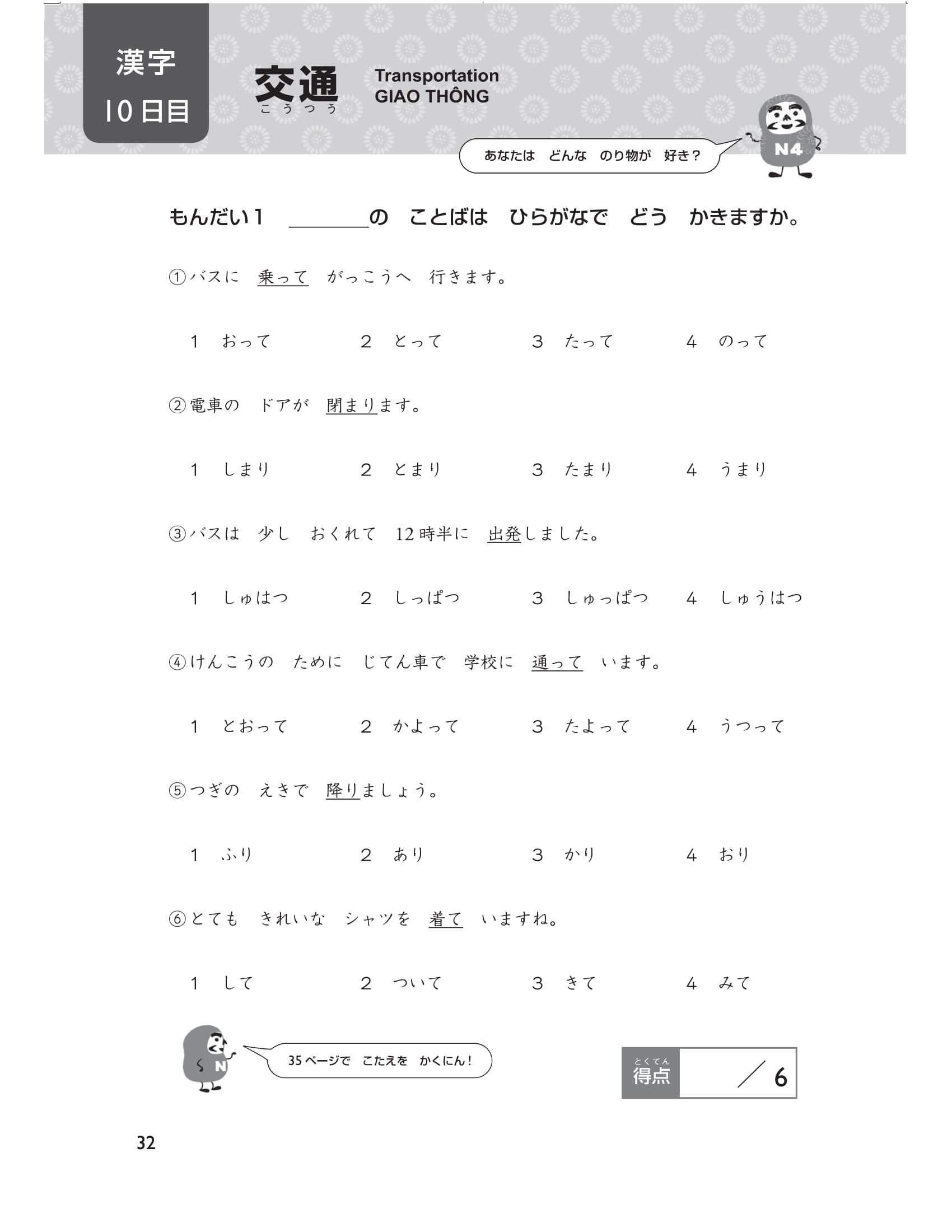 Cuối cùng, có 5 bài thi thử (tổng cộng 40 câu hỏi) mô phỏng đề thi năng lực tiếng Nhật. Thử thách bản thân ngay trước kỳ thi bằng cách xem lại nhiều lần những chỗ mình đã sai ( thứ tự các phần trong đề thi chính thức là chữ Hán, từ vựng và cuối cùng là ngữ pháp) bạn nhé. Hãy sử dụng cuốn sách này một cách hiệu quả Chúng tôi đã chuẩn bị rất nhiều câu hỏi để các bạn có thể luyện tập trong 15 ngày theo thứ tự các phần: chữ Hán, từ vựng, ngữ pháp. Hơn nữa, thông qua bảng checklist bạn có thể dễ dàng phân bổ số lượng câu hỏi nên làm trong một ngày và sắp xếp kế hoạch học tập cho đến thời điểm thi sao cho phù hợp.
