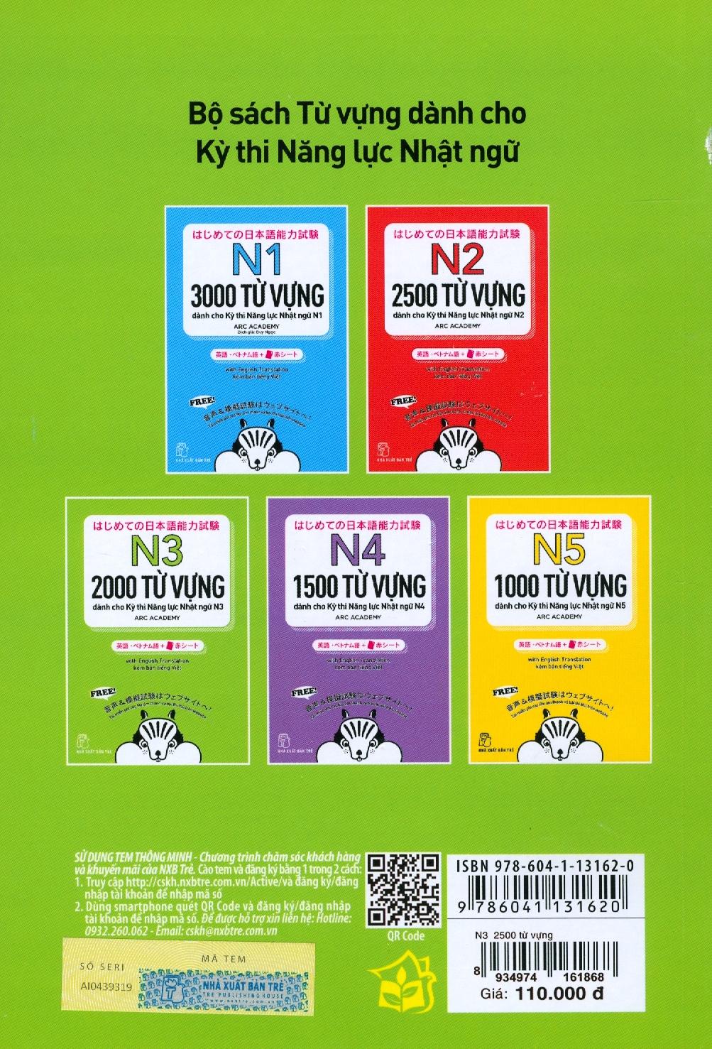 Mua tại TiktokBộ sách học từ vựng cấp độ N5 ~ N1 dành cho Kỳ thi Năng lực Nhật ngữ. Bộ sách gồm 5 cuốn: N1, N2, N3, N4, N5, tập hợp các từ vựng xuất hiện thường xuyên trong các kỳ thi Năng lực Nhật ngữ. Các từ vựng này được chia theo từng chủ đề, đi kèm các câu ví dụ. Đặc biệt bộ sách có kèm theo bản dịch Anh - Trung - Việt, rất tiện cho các bạn tự học ở nhà.