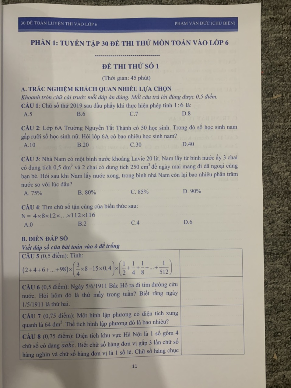 Mua tại TiktokNội dung gồm có: Phần 1. Tuyển tập 30 đề thi thử môn toán vào lớp 6 Đề thi thử số 1 Đề thi thử số 2 Đề thi thử số 3 Đề thi thử số 4 Đề thi thử số 5 Đề thi thử số 30 Phần thứ 2. Hướng dẫn giải chi tiết Tác giả: Phan Văn Đức, Vũ Thị Bích Doan, Nguyễn Thị Lan Anh, Nguyễn Thu Hương, Nguyễn Thuỳ Trang, Nguyễn Hải Long Số trang: 236 Xuất bản: 2020 Nhà xuất bản: Đại học quốc gia Hà Nội Công ty phát hành: Nxb Đại học quốc gia Hà Nội