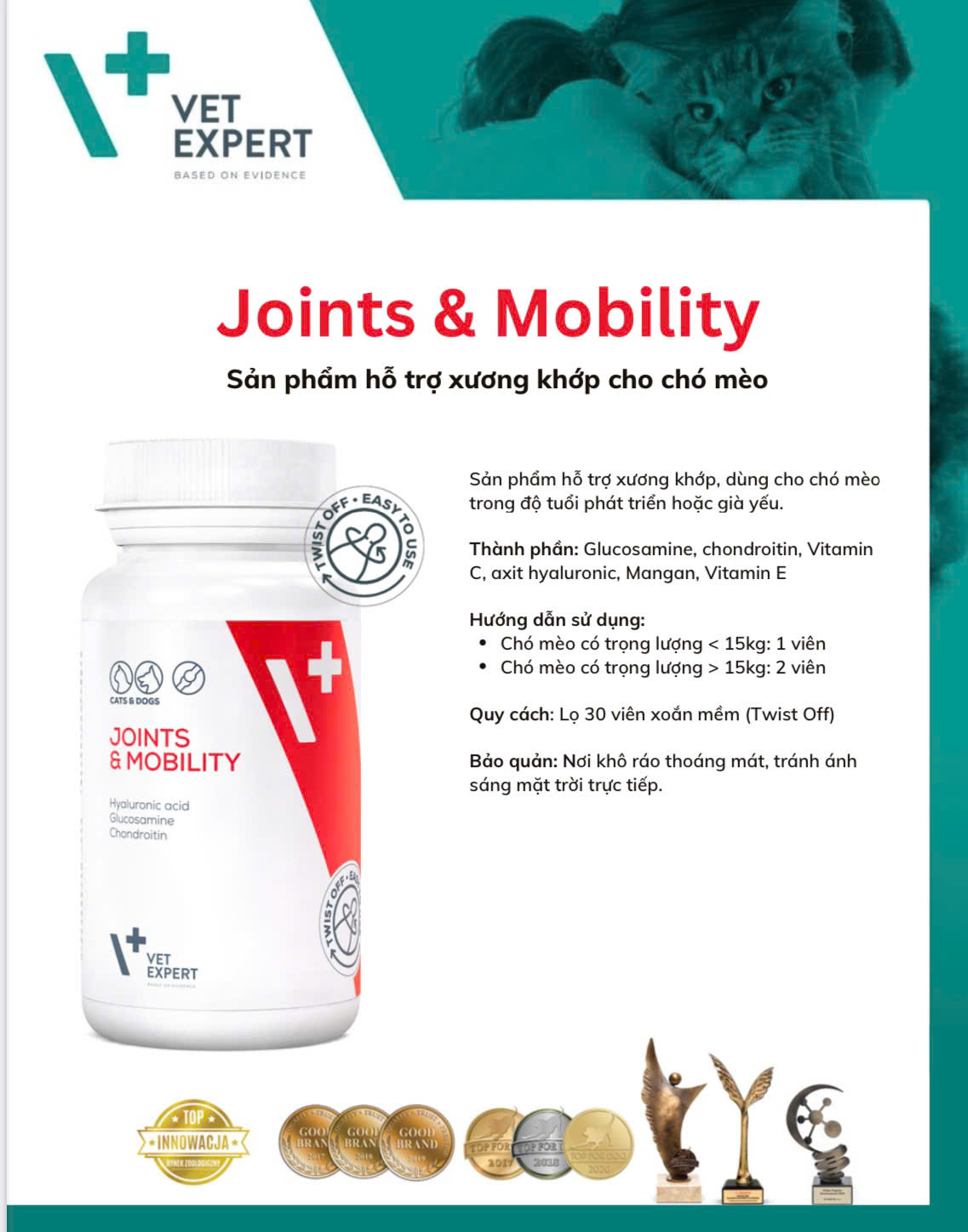 Mua tại Tiktok- Xuất xứ: BA LAN -Sản phẩm hỗ trợ miễn dịch chó mèo Sản phẩm giúp hỗ trợ miễn dịch không đặc hiệu cho chó và mèo Dùng cho thú cưng bị căng thẳng như chó con đang lớn, chó già, chó tăng nguy cơ nhiễm trùng do virus hoặc vi khuẩn gây bệnh, chó cái trong thai kì nhằm kích thích chế độ miễn dịch từ mẹ truyền sang con Thành phần: HMB-Ca, β-glucan, chiết xuất hoa cúc tím. Hướng dẫn sử dụng: Chó mèo có trọng lượng < 15kg: 1 viên Chó mèo có trọng lượng > 15kg: 2 viên Quy cách: lọ 30 viên. Bảo quản: nơi khô ráo thoáng mát, tránh ánh sáng mặt trời trực tiếp. Joints & Mobility Sản phẩm hỗ trợ xương khớp cho chó mèo Khuyến khích dùng cho chó mèo trong độ tuổi phát triển hoặc già yếu. Thành phần: Glucosamine, chondroitin, Vitamin C, axit hyaluronic, Mangan, vitamin E Multivitamin Sản phẩm bổ sung vitamin và khoáng cho chó mèo Sản phẩm bao gồm các vitamin thiết yếu khoáng chất cần thiết cho cơ thể. Lưu ý không cho ăn vượt quá hàm lượng dinh dưỡng tiêu chuẩn mỗi ngày. Sản phẩm phù hợp cho chó mèo ở mọi lứa tuổi. Thành phần: Vitamin B3, kẽm, vitamin E Sắt, Vitamin B1, vitamin B2, vitamin B6, Mangan, đồng, axit folic, biotin, vitamin B12, vitamin A, vitamin D3. Skin & Coat Sản phẩm dành cho chó mèo có vấn đề về lông da Hỗ trợ chức năng lông da ở chó mèo. Khuyến cáo dùng cho chó mèo bị khô lông, rụng lông, xỉn màu, da khô, ngứa ngáy, khó chịu. Thành phần: Omega 3, omega 6, kẽm, vitamin E, biotin, vitamin A.