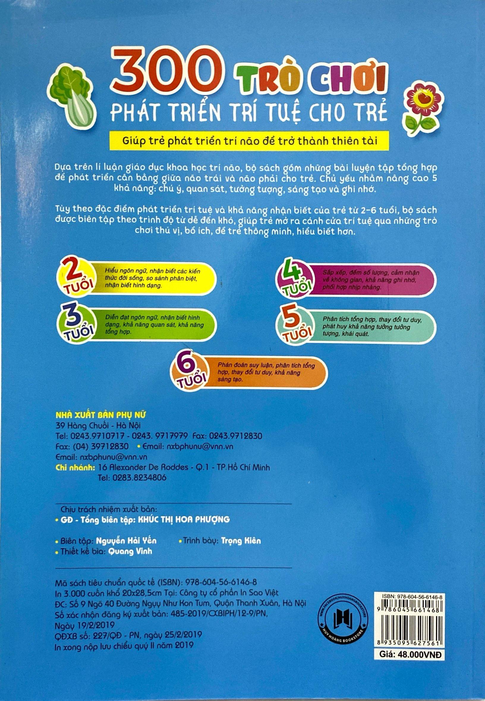 300 Trò Chơi Phát Triển Trí Tuệ Cho Trẻ 2 Tuổi (Tái Bản 2019) Dựa trên lí luận giáo dục khoa học trí não, bộ sách gồm những bài luyện tập tổng hợp để phát triển cân bằng giữa não trái và não phải cho trẻ. Chủ yếu nhằm nâng cao 5 khả năng: chú ý, quan sát, tưởng tượng, sáng tạo và ghi nhớ. Tùy theo đặc điểm phát triển trí tuệ và khả năng nhận biết của trẻ từ 2-6 tuổi, bộ sách được biên tập theo trình độ từ dễ đến khó, giúp trẻ mở ra cánh cửa trí tuệ qua những trò chơi thú vị, bổ ích, để trẻ thông minh, hiểu biết hơn. 2 tuổi – Hiểu ngôn ngữ, nhận biết các kiến thức đời sống, so sánh phân biệt, nhận biết hình dạng. 3 tuổi – Diễn đạt ngôn ngữ, nhận biết hình dạng, khả năng quan sát, khả năng tổng hợp. 4 tuổi – Sắp xếp, đếm số lượng, cảm nhận về không gian, khả năng ghi nhớ, phối hợp nhịp nhàng. 5 tuổi – Phân tích tổng hợp, thay đổi tư duy, phát huy khả năng tưởng tượng, khái quát. 6 tuổi – Phán đoán suy luận, phân tích tổng hợp, thay đổi tư duy, khả năng sáng tạo .