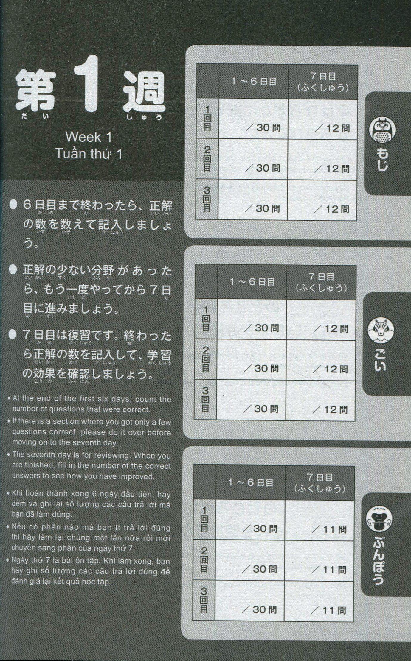 Điểm đặc biệt là sách được thiết kế theo ngày, mỗi ngày người học có thể ôn cả 3 kỹ năng : Từ vựng, Ngữ pháp, Hán tự chỉ với 15 phút. · Khổ sách