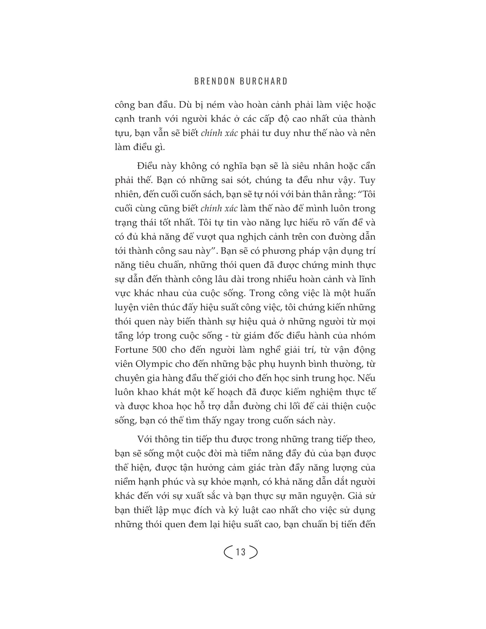 - Thể hiện lòng can đảm Cuốn sách “High performance habits – 6 thói quen của người làm việc hiệu suất cao” diễn giải chi tiết cách thức để thực hành những thói quen này. Cuốn sách đã tổng hợp những nghiên cứu trong 20 năm của tác giả Brendon Burchard từ hoạt động huấn luyện của mình. Đây là các tổng kết đắt giá nhất có được nhờ các cuộc khảo sát, phỏng vấn tiêu chuẩn và các công cụ đánh giá chuyên nghiệp về những người có hiệu suất cao trên toàn thế giới. Tác phẩm hé lộ một người nên nắm bắt điều gì để trở thành một người hiệu suất cao – có thể tạo ra những cấp độ ngày càng tăng của hạnh phúc, sức khỏe và thành công lâu dài. Nếu bạn muốn hình thành một thói quen nào mới để thành công nhanh hơn, hãy chọn những thói quen trong cuốn sách này. Bất cứ ai cũng có thể thực hành chúng, và bạn sẽ thấy những điều phi thường xảy ra trong cuộc sống, các mối quan hệ và sự nghiệp. Nếu bạn muốn đạt được nhiều thứ hơn, lãnh đạo tốt hơn, phát triển kĩ năng nhanh hơn, hoặc đạt được nhiều niềm vui và tự tin hơn, “High performance habits – 6 thói quen của người làm việc hiệu suất cao” sẽ trợ giúp đắc lực cho bạn.