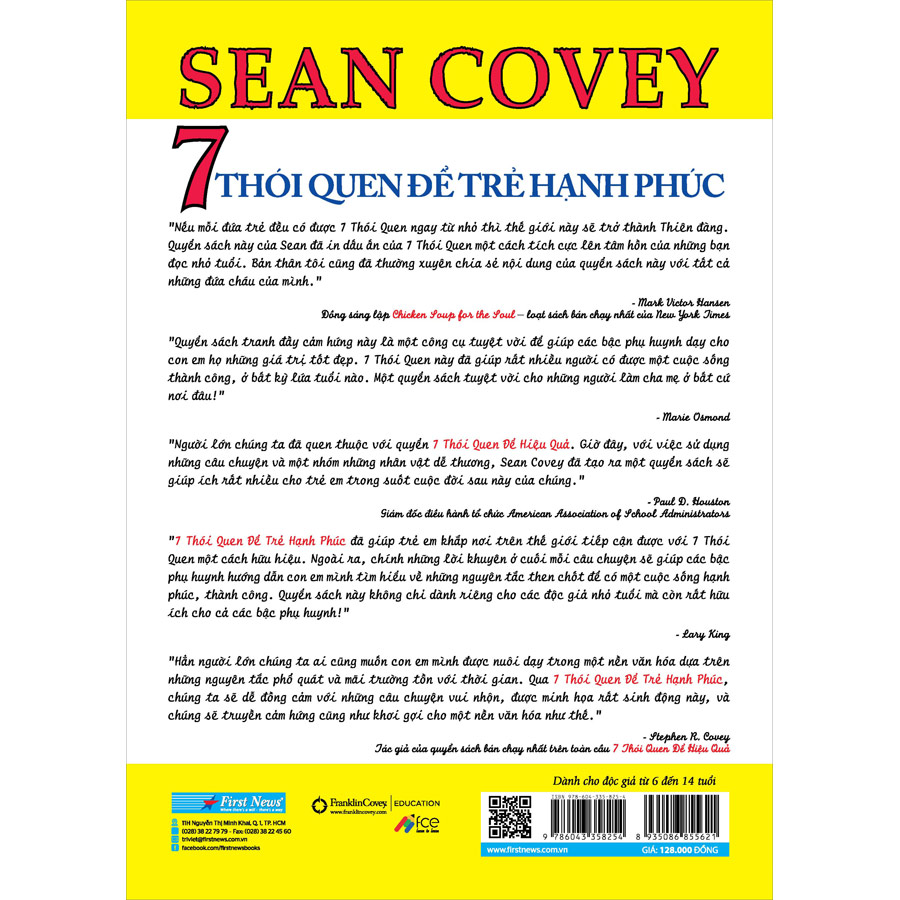 7 thói quen để trẻ hạnh phúc giúp các em tiếp cận với những giá trị và nguyên tắc bất hủ được đề cập trong cuốn 7 Thói Quen Để Thành Đạt được Sean Covey viết trước đó – từ việc làm sao để chịu trách nhiệm với cuộc sống của chính mình đến việc khám phá vì sao trạng thái vui vẻ luôn là tốt nhất.