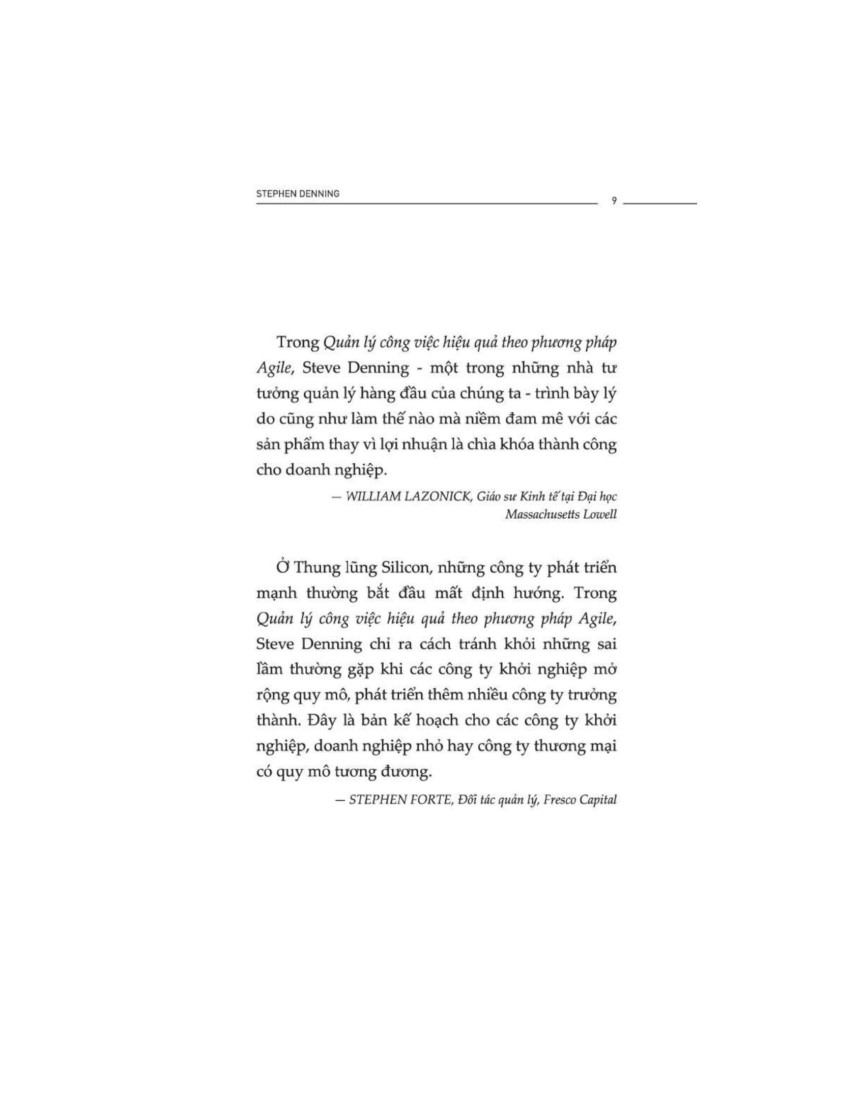 Với các công thức đột phá, mô hình Agile cho phép đội nhóm, đơn vị hoặc doanh nghiệp nhanh chóng tích lũy và nâng cấp các sản phẩm và dịch vụ để đáp ứng nhu cầu thay đổi liên tục, thậm chí ngay cả những tổ chức “khổng lồ toàn cầu” cũng có thể học cách tổ chức tinh gọn và hành động linh hoạt trong kinh doanh.