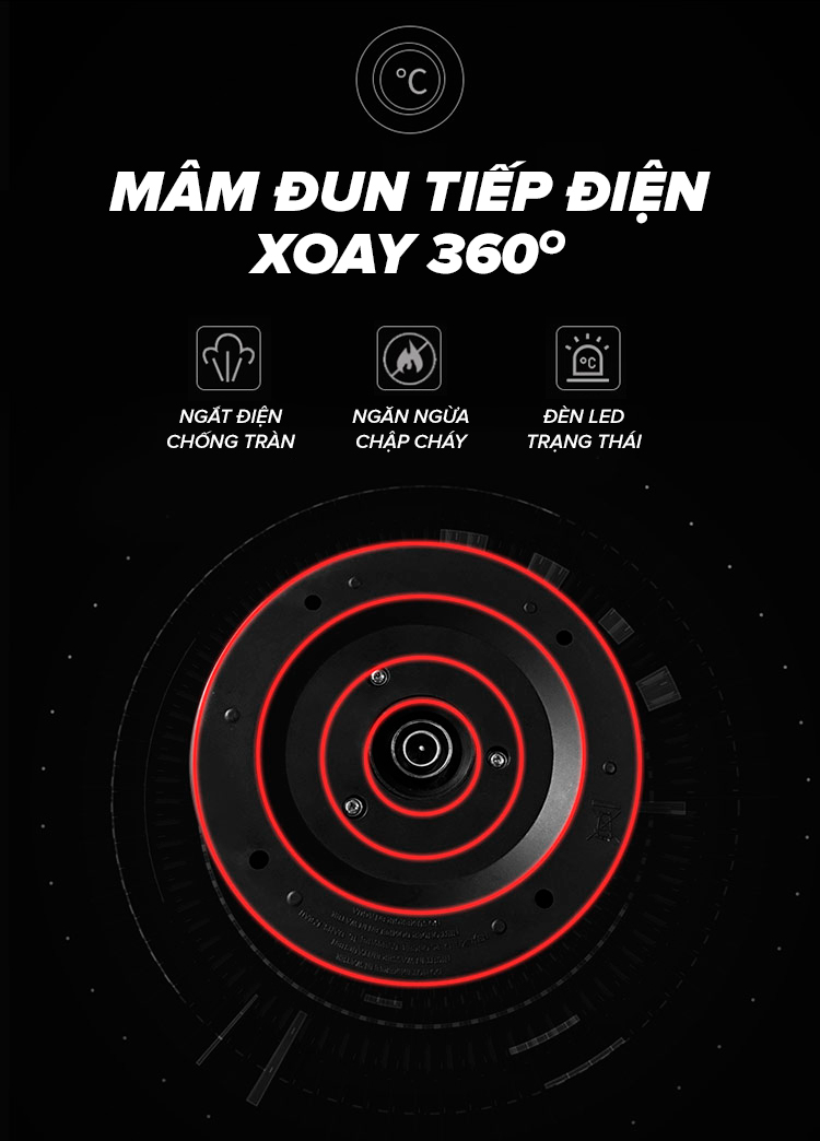 - Mâm đun tiếp điện được thiết kế xoay 360 độ
