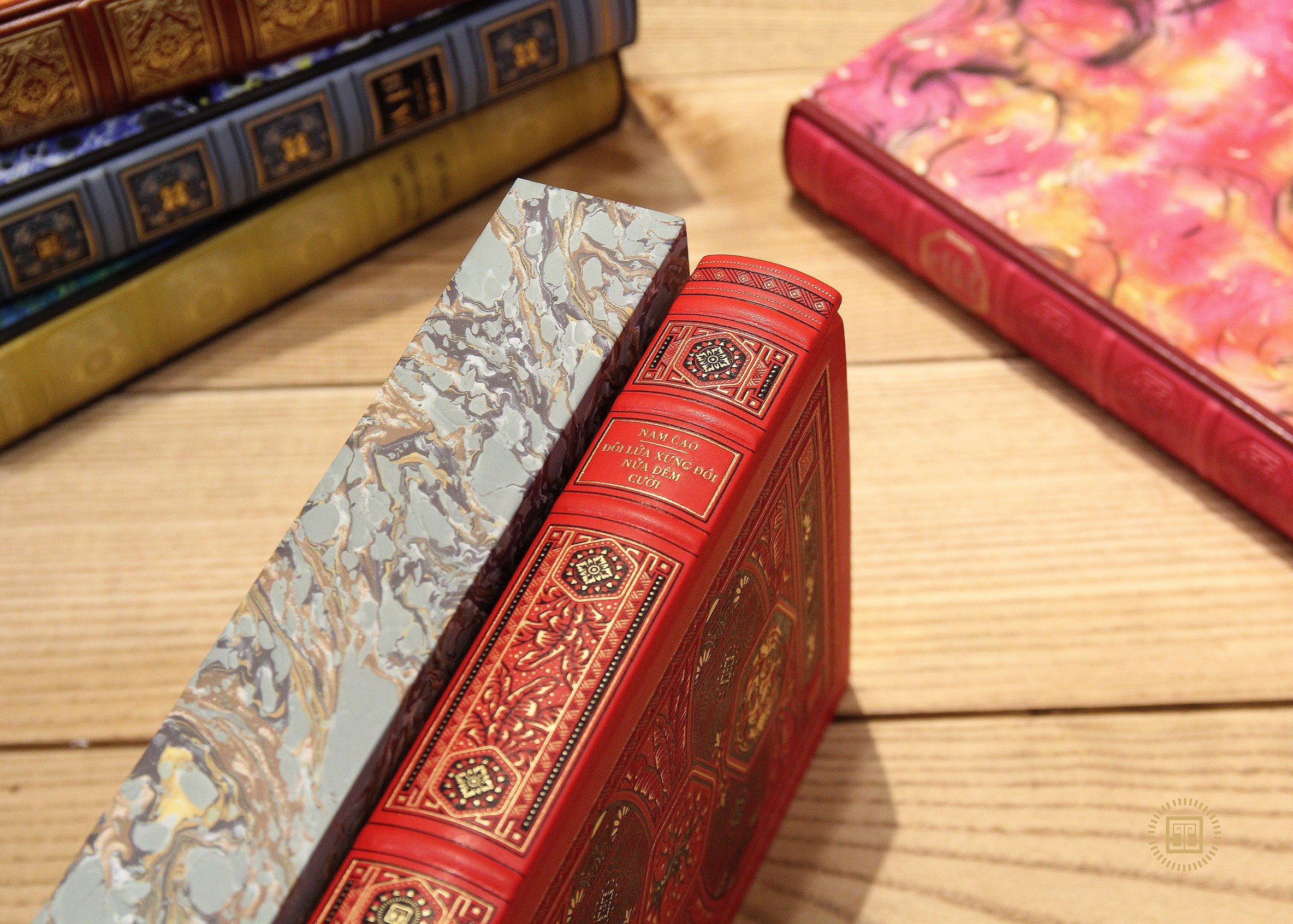• Bìa sách được bọc bằng da microfiber. Hoa văn dập chìm. Tên sách và một số họa tiết ép nhũ 2 màu đen và vàng.