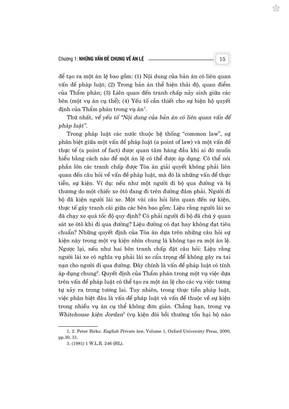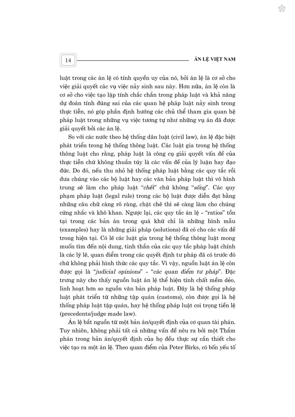 Trên cơ sở khái quát quá trình phát triển án lệ ở Việt Nam và kinh nghiệm xây dựng, áp dụng án lệ ở một số quốc gia trên thế giới, cuốn sách chuyên khảo Án lệ Việt Nam phân tích thực trạng áp dụng án lệ trong thực tiễn xét xử và khuyến nghị một số giải pháp nhằm nâng cao chất lượng quá trình nghiên cứu, đề xuất, công bố và áp dụng án lệ. Ngoài 3 chương chính, phần phụ lục của cuốn sách giới thiệu toàn văn 72 án lệ đã được công bố và phát triển từ các bản án, quyết định của Tòa án nhân dân các cấp. Đây là thành tựu quan trọng trong cải cách hoạt động tư pháp của ngành Tòa án nói chung, cũng như từ đóng góp của các tổ chức, nhà khoa học pháp lý, chuyên gia, luật sư trong hoạt động xây dựng và phát triển án lệ. Cuốn sách là tài liệu quý trong việc tìm hiểu, nghiên cứu và viện dẫn án lệ cho các Thẩm phán, Hội thẩm và các chức danh tư pháp của Tòa án, cũng như bạn đọc quan tâm đến vấn đề này. Trân trọng giới thiệu cuốn sách với bạn đọc