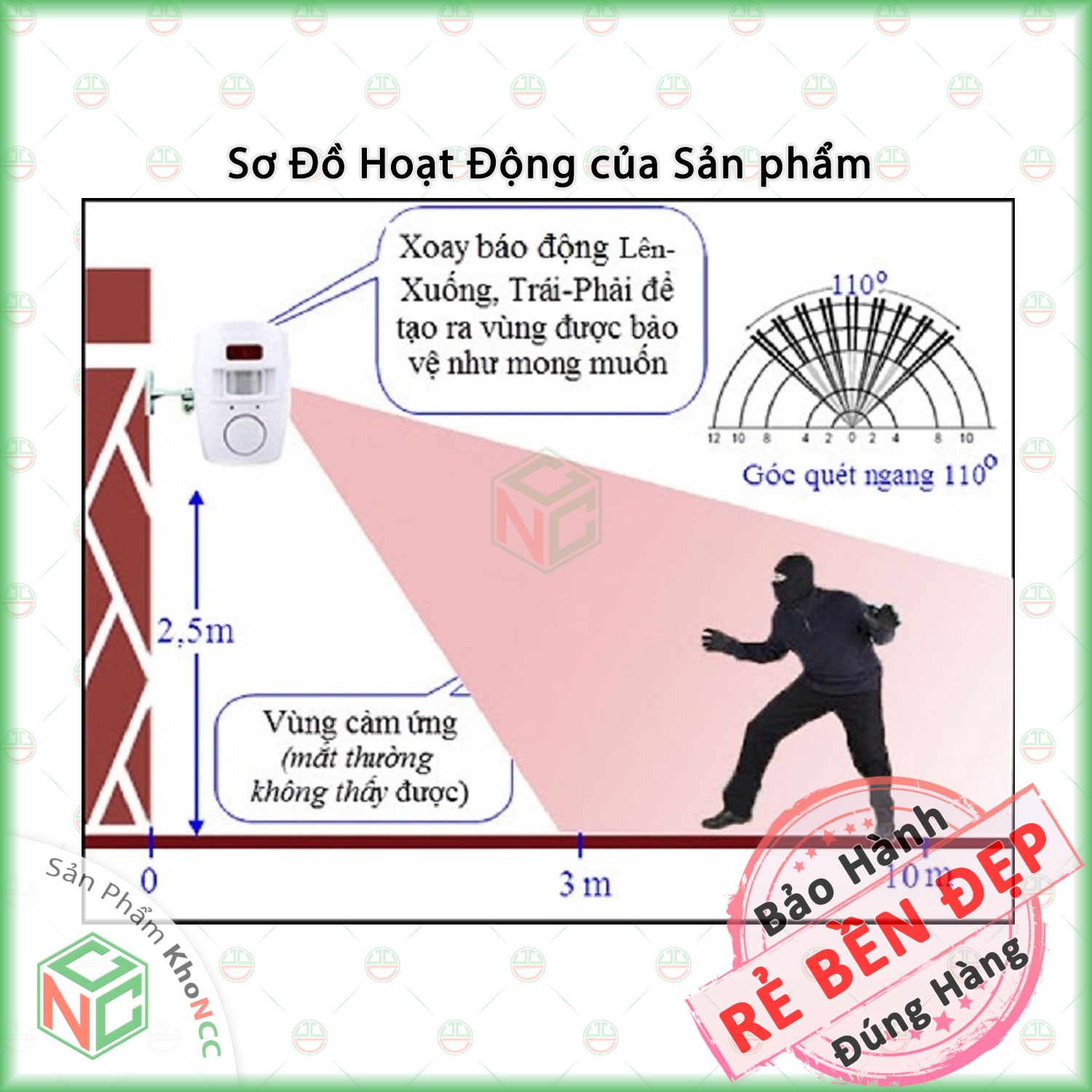 - Phạm vi phát hiện: Khoảng cách tầm 8 mét, góc 110 độ