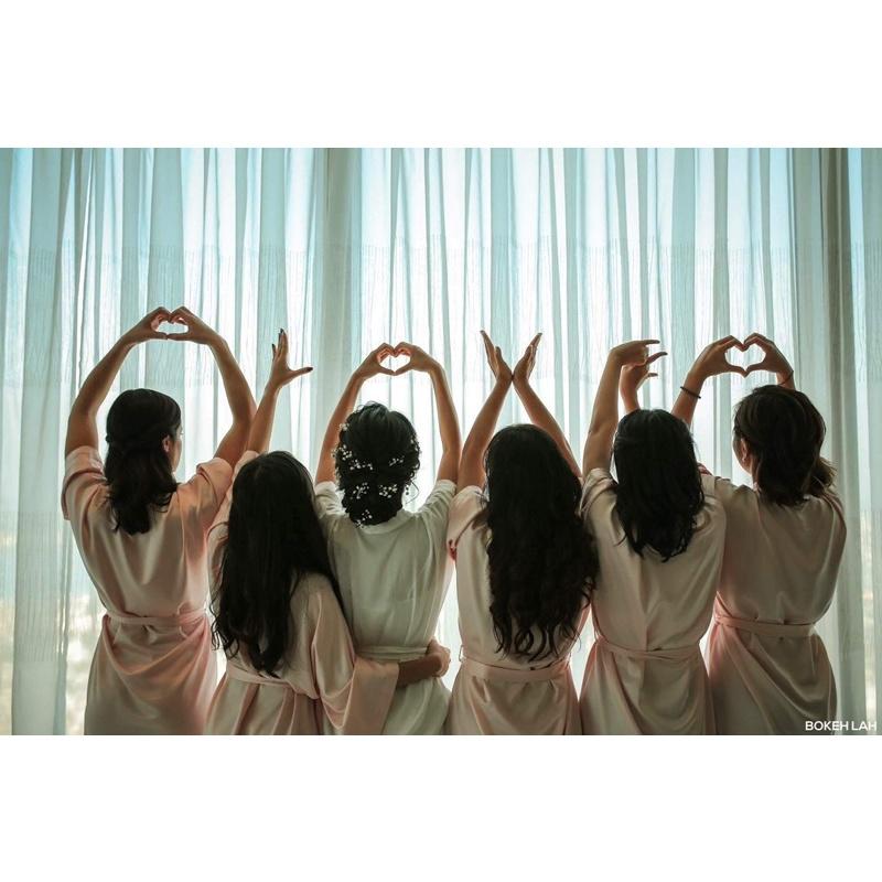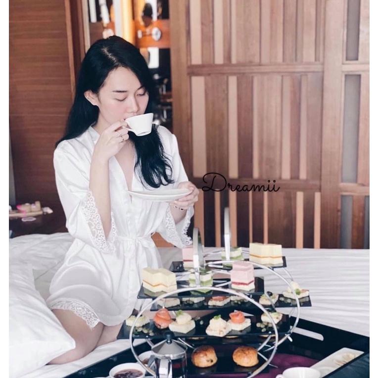 Với thiết kế ngọt ngào, một bộ choàng không thể thiếu trong bộ ảnh của cô dâu với chiếc đai thắt ngang tạo điểm nhấn của bộ đồ ngủ cùng với chữ được thêu cẩn thận ở sau áo.