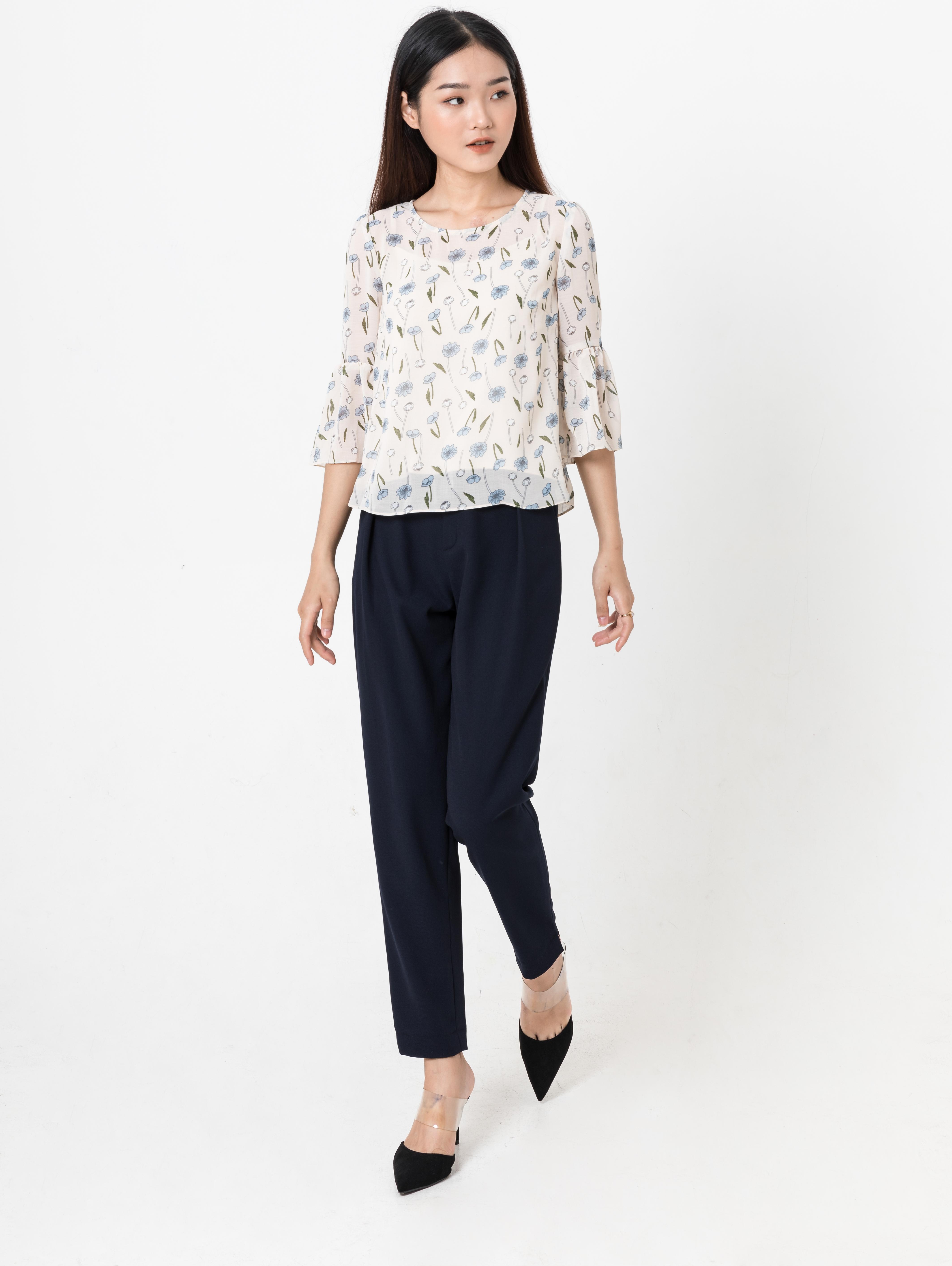 Áo croptop voan hoa với phần tay chuông trẻ trung, nữ tính. Áo có thể phối với nhiều loại trang phục theo nhiều phong cách từ quần, chân váy công sở đến quần sóc, chân