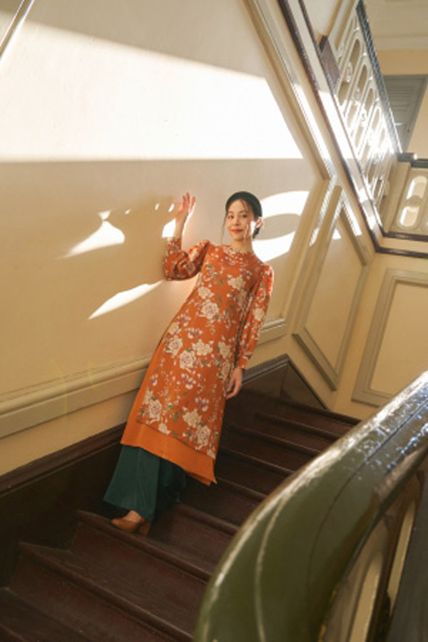 Thiết kế Áo dài nữ họa tiết hoa lá vàng đỏ cao cấp phong cách đường may tỉ mỉ. Áo thiết kế form vừa vặn giúp tôn được đường nét phong cách của các tính