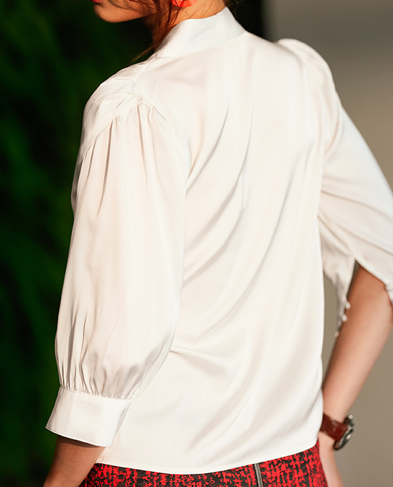 Áo kiểu dáng suông Không tay Cổ cao viền bèo, ruy băng gân viền thắt nơ cổ Cài bằng nút phía sau Chất liệu chính: Polyester Ruy băng gân Polyester Cắt may thủ công tinh