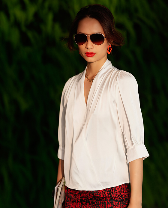 Áo Đắp Vạt Indy TOP190 Thời trang thiết kế HityKiểu dáng áo suôngCổ VThân trước đắp vạtVai xếp lyTay nhún vai, dài qua khuỷ tay, cài bẳng 3 nút khuy dâyCHẤT LIỆUPolyester SatinCắt may thủ ...