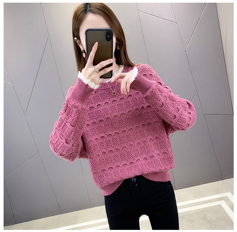 Áo len nữ dài tay cổ tròn đan rỗng kẻ ô