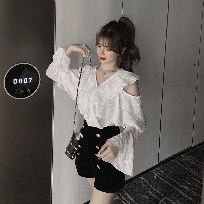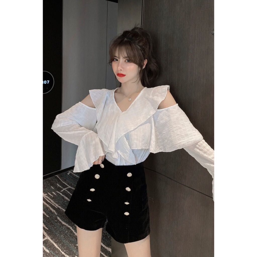 ✨Áo sơ mi nhún bèo hở vai thời trang Hàn Quốc