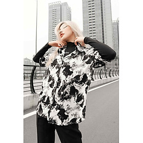 CHẤT LIỆU MANGO, MỀM MƯỢT, KHÔNG NHĂN ÁO MÀU TRẮNG, HOẠ TIẾT MÀU ĐEN ÁO SOMI NẸP GIẤU NÚT FORM RỘNG FREESIZE ĐIỂM NHẤN 1 BÊN TAY PHẢI ÁO GẮN TAG LOGO LAAS