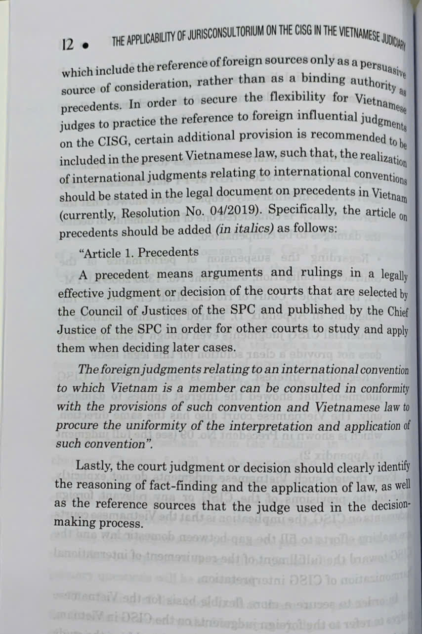 The book, “APPLICABILITY OF JURISCONSULTORIUM ON THE CISG IN THE VIETNAMESE JUDICIARY UNDER ITS “PRECEDENT SYSTEM,” aims to addre.ss these core questions, especially within the context of Vietnamese law. The work delves into analyzing the applicability and interpretation of the CISG within the Vietnamese judicial system, a country in the process of developing and perfecting its precedent system. By exploring the connection between CISG principles and Vietnam’s precedent system, the book not only provides a comprehensive overview of current practices but also proposes practical solutions to promote a more effective and uniform application of the CISG.