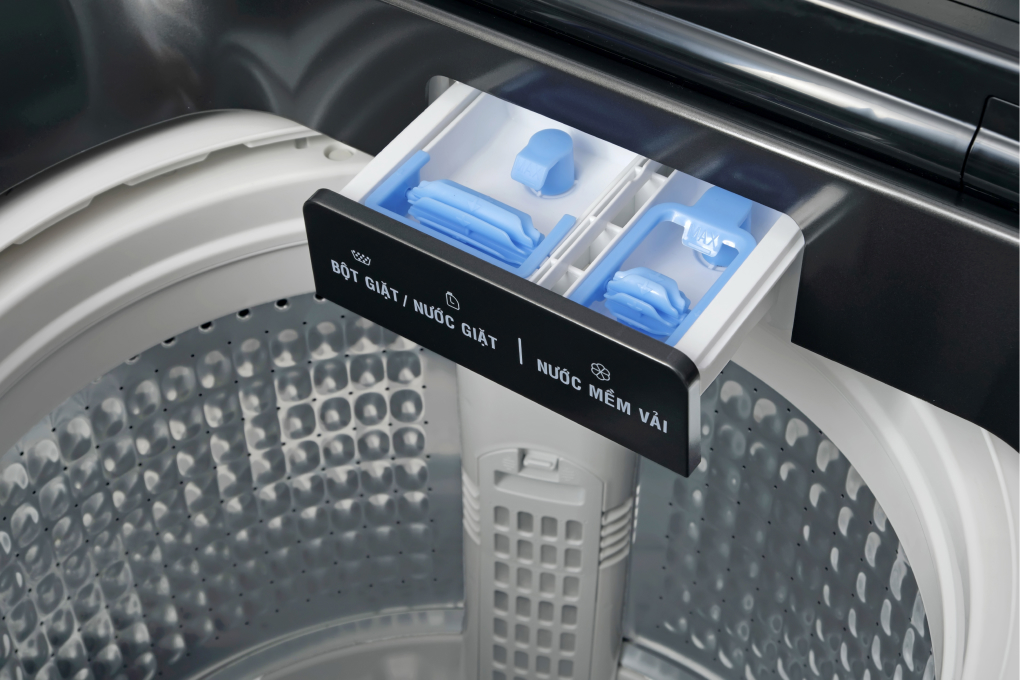- Bảng điều khiển song ngữ Anh - Việt dễ sử dụng kết hợp với núm xoay để lựa chọn chương trình giặt làm cho việc thao tác trở nên thuận tiện hơn cho người dùng. Bên cạnh đó, bảng điều khiển được đặt phía sau cũng giúp người dùng dễ dàng hơn trong việc vận hành .