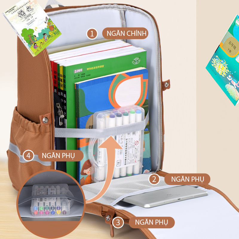 TÍNH NĂNG SẢN PHẨM ️Ba lô toàn diện với đệm mút dày êm giúp chống xô lệch, quai đeo trợ lực, đệm lưng thoát khí, nút điều chỉnh độ dài dây đeo, dây cài ngực. ️