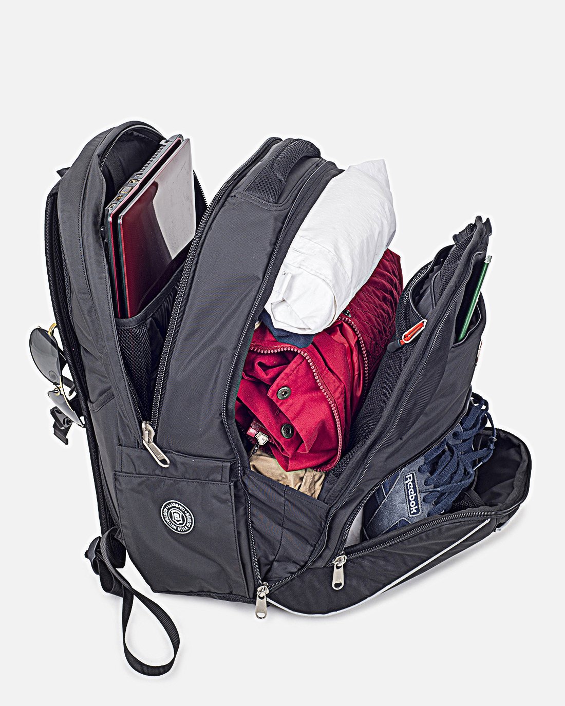 Ba ngăn chính rộng rãi thiết kế đặc biệt thông minh dành cho những ngưởi thường xuyên đi công tác, mà phải mang theo cả bộ , cần (, , pin sạc và các công cụ khác) hoăc có thể sử dụng chơi thề thao, có ngăn chứa giầy rộng rãi, cực kì đa năng và lý tưởng dành cho người bận rộn.(Ba ngăn chính rộng rãi các ngăn phụ thiết kế đa chức năng có thể chứa quần áo từ 05 đến 08 bộ đồ, giày dé, chứa Laptop 14 inch –17 inch,Tablet 10 –12 inch riêng biệt chống trầy xước và rung lắc , ngăn điện thoại di động, thẻ nhớ, ổ cứng, tai nghe, hồ sơ,giấy tờ, mắt kính, khe đựng viết, ngăn chứa Namecard, Passport …)