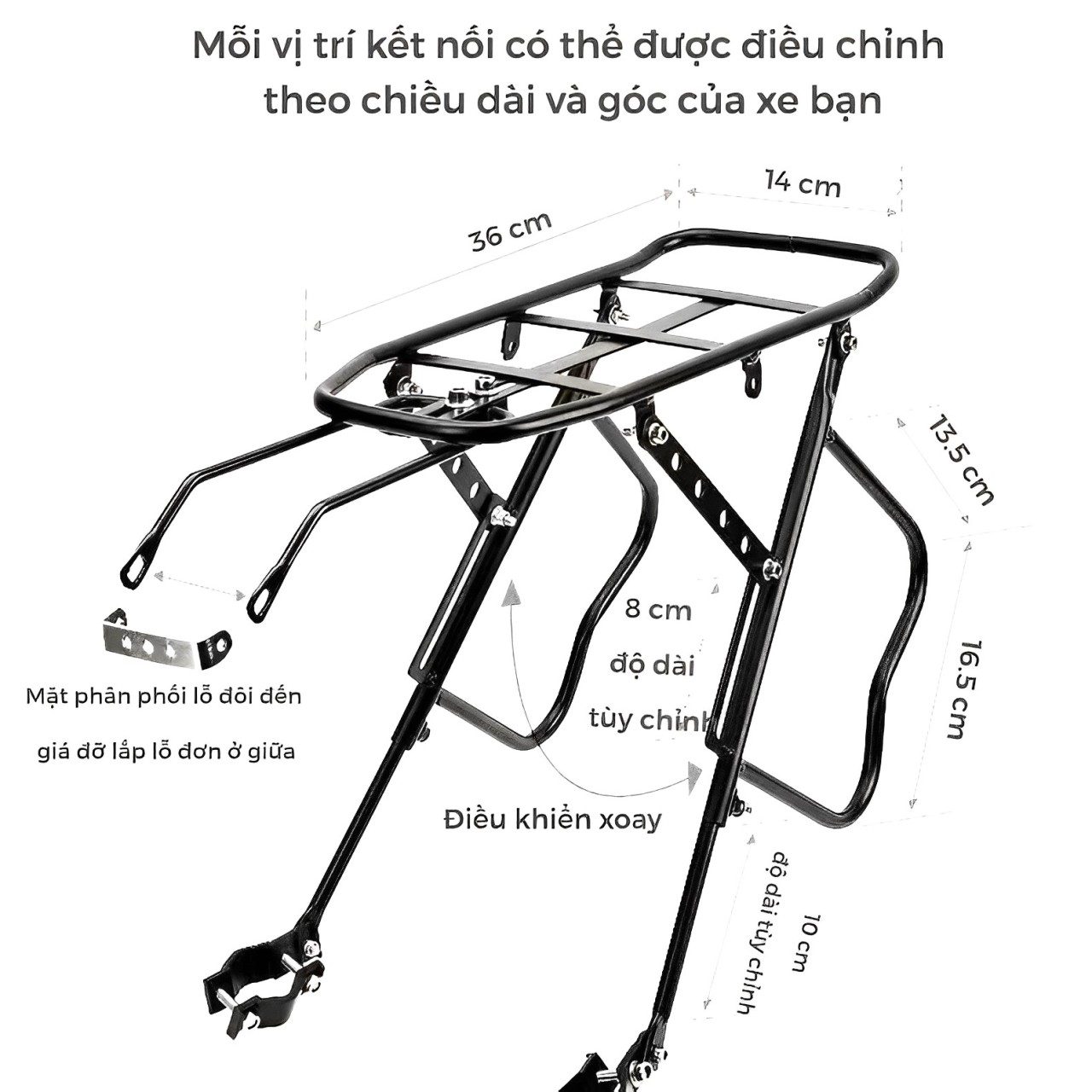 - Có thể điều chỉnh chiều cao và chiều dài, phù hợp với xe đạp từ bánh xe 20'' đến 29' inch';