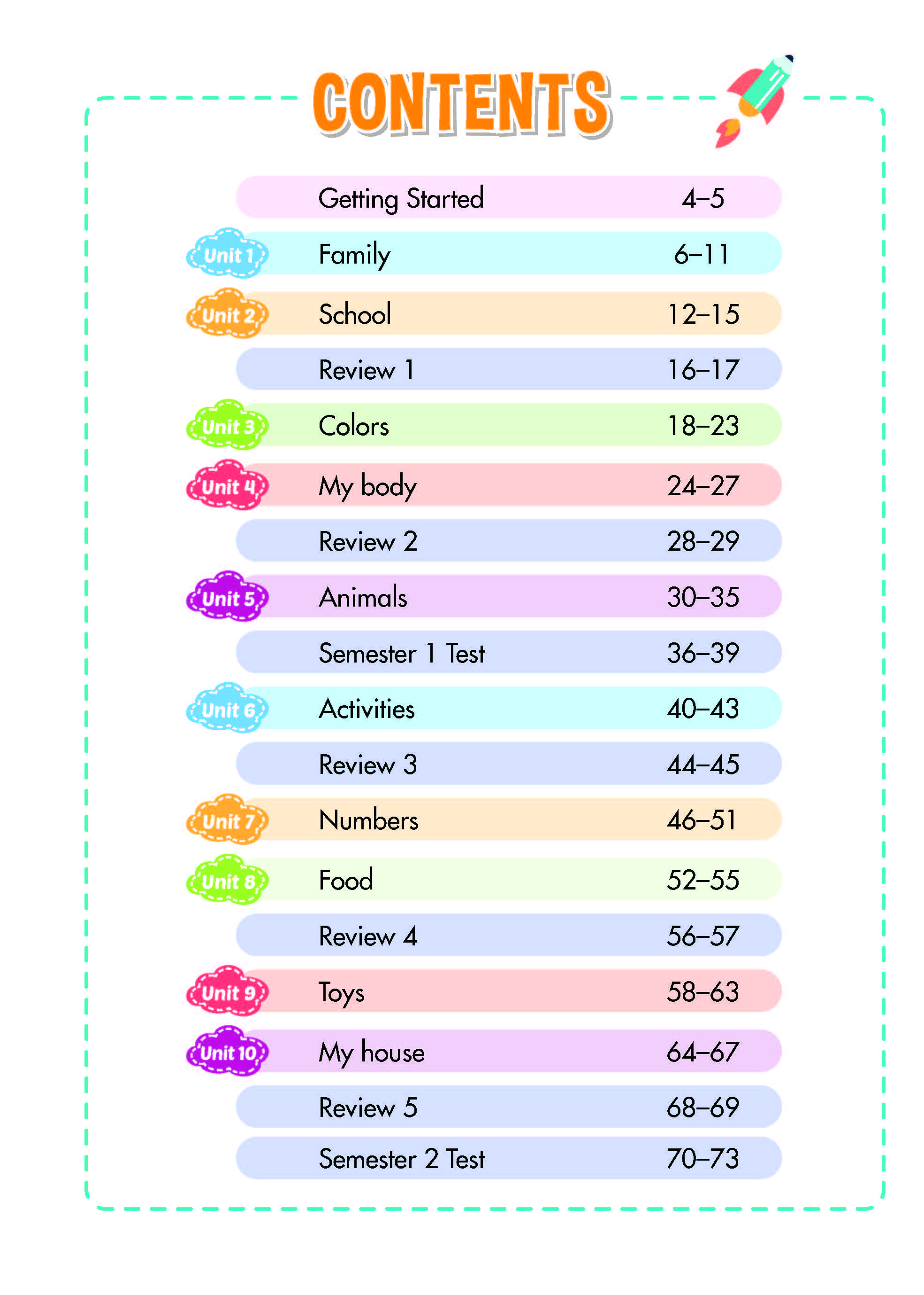Sách : Learning English - Tiếng Anh Lớp 2 & Lớp 3 (7 - 9 Tuổi ) Nội Dung : - Bảng mục lục: Chỉ rõ các mục tiêu chính và trọng tâm của mỗi