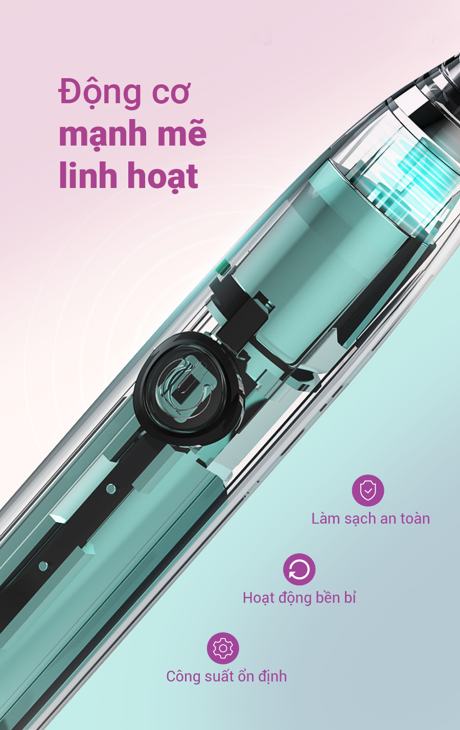 Công nghệ độc đáo của chúng tôi đảm bảo làm sạch hiệu quả và nhẹ nhàng Sự rung động mạnh mẽ của lông bàn chải tạo ra những viên sỏi nhỏ sâu giữa các kẽ