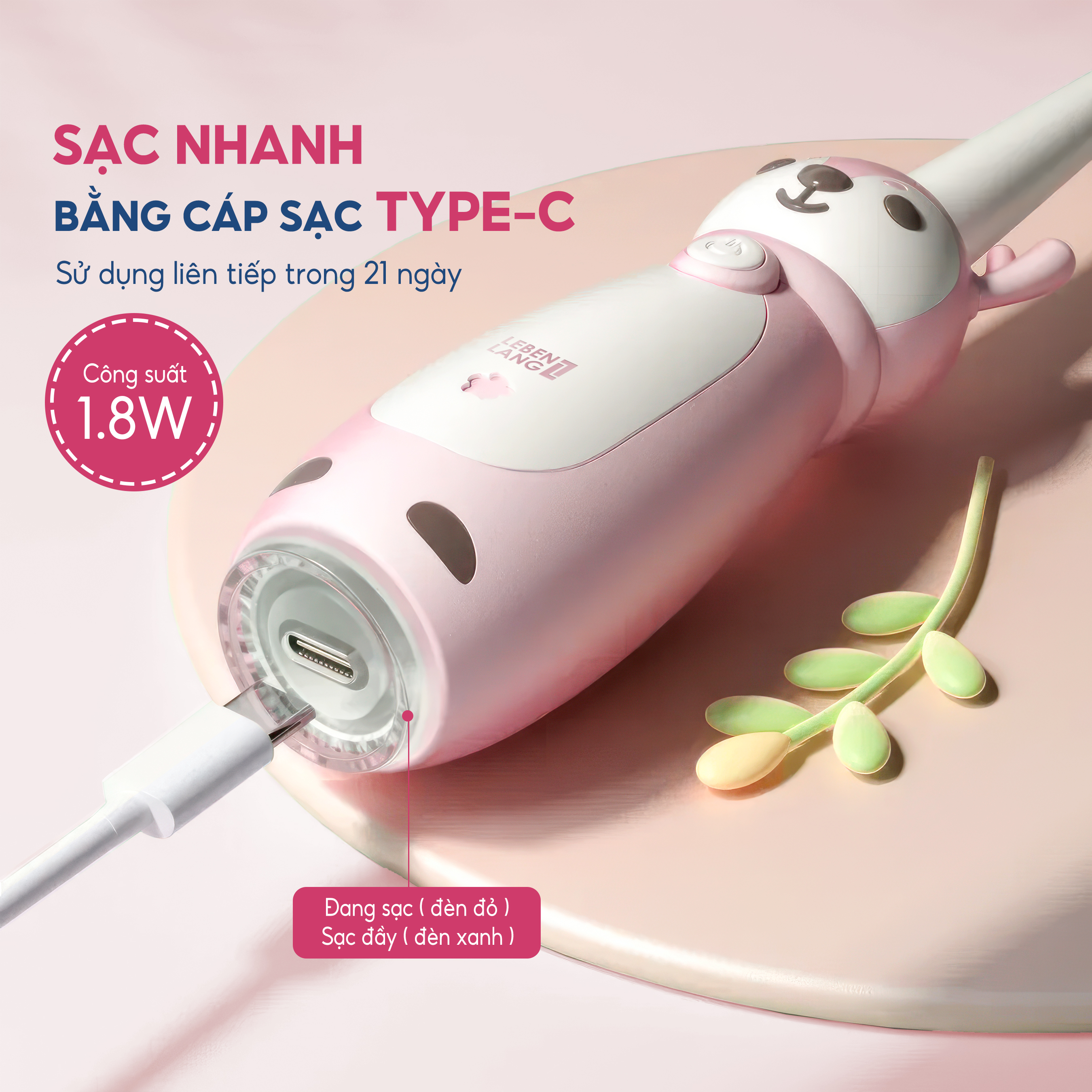 Đặc biệt, bàn chải điện Lebenlang được trang bị sạc nhanh Type-C, giúp bố mẹ tiết kiệm thời gian sạc so với các bàn chải điện thông thường. Pin sạc của sản phẩm có dung lượng lớn, có thể sử dụng liên tiếp trong 21 ngày.