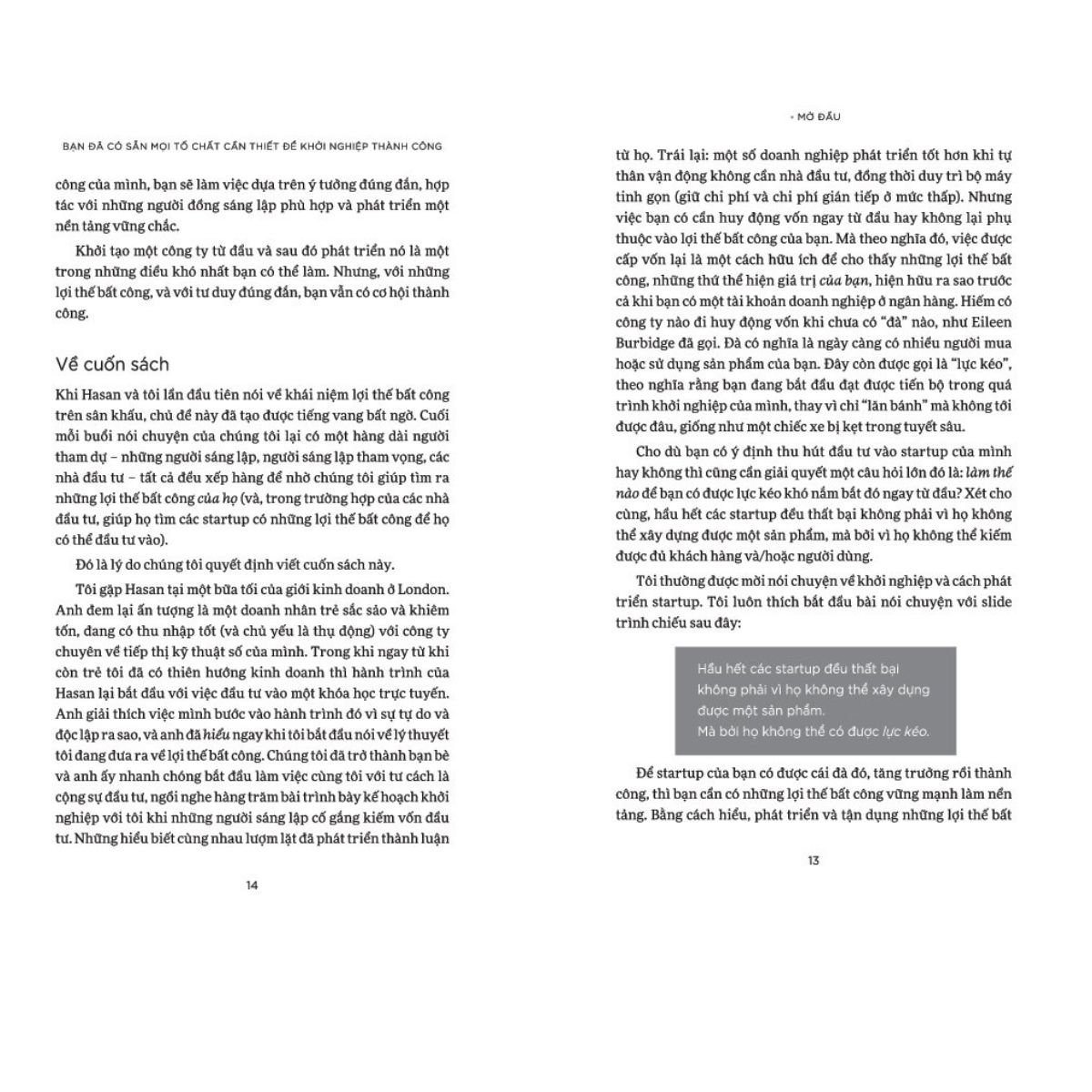 Bạn Đã Có Sẵn Mọi Tố Chất Cần Thiết Để Khởi Nghiệp Thành Công Đây là quyển sách đã giành giải thưởng Sách Kinh tế hay nhất năm 2021 của Vương quốc Anh. Đâu là sự khác biệt giữa một công ty khởi nghiệp thành công với một công ty thất bại đau thương? Đằng sau mỗi câu chuyện thành công là một lợi thế bất công. Nhưng lợi thế bất công không chỉ nằm ở chỗ bố mẹ bạn giàu có ra sao hay bạn quen biết nhân vật nào, ai cũng có thể có một lợi thế nào đó. Lợi thế bất công là yếu tố giúp bạn ưu việt hơn đối thủ. Cuốn sách đột phá này chỉ ra cách xác định Lợi thế Bất công của riêng bạn và vận dụng chúng vào bất kỳ dự án nào. Dựa trên hơn hai thập kỷ kinh nghiệm thực tiễn, bao gồm cả thời gian làm giám đốc tiếp thị đầu tiên cho Just Eat (một công ty khởi nghiệp hiện trị giá hơn 5 tỉ bảng Anh), các tác giả đưa ra một khuôn khổ độc đáo để đánh giá ngoại cảnh, bên cạnh sức mạnh nội tại của bạn. Cần cù và gan góc là chưa đủ, vì vậy họ khám phá cả tầm quan trọng của tiền bạc, trí tuệ, vị trí, học vấn, chuyên môn, vị thế và may mắn trong hành trình đi đến thành công. Từ việc thành lập công ty của riêng mình, đến việc đạt được sức hút, huy động vốn và tăng trưởng,  giúp bạn nhìn lại mình và tìm ra những yếu tố bạn vốn có nhưng bản thân chưa từng nhận ra, để thành công được trong thế giới kinh doanh khốc liệt.