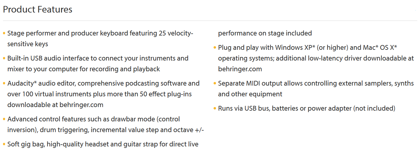 Đầu ra MIDI riêng biệt cho phép điều khiển bộ lấy mẫu bên ngoài, bộ tổng hợp và các thiết bị khác Chạy qua bus USB, pin hoặc bộ đổi nguồn (không bao gồm)