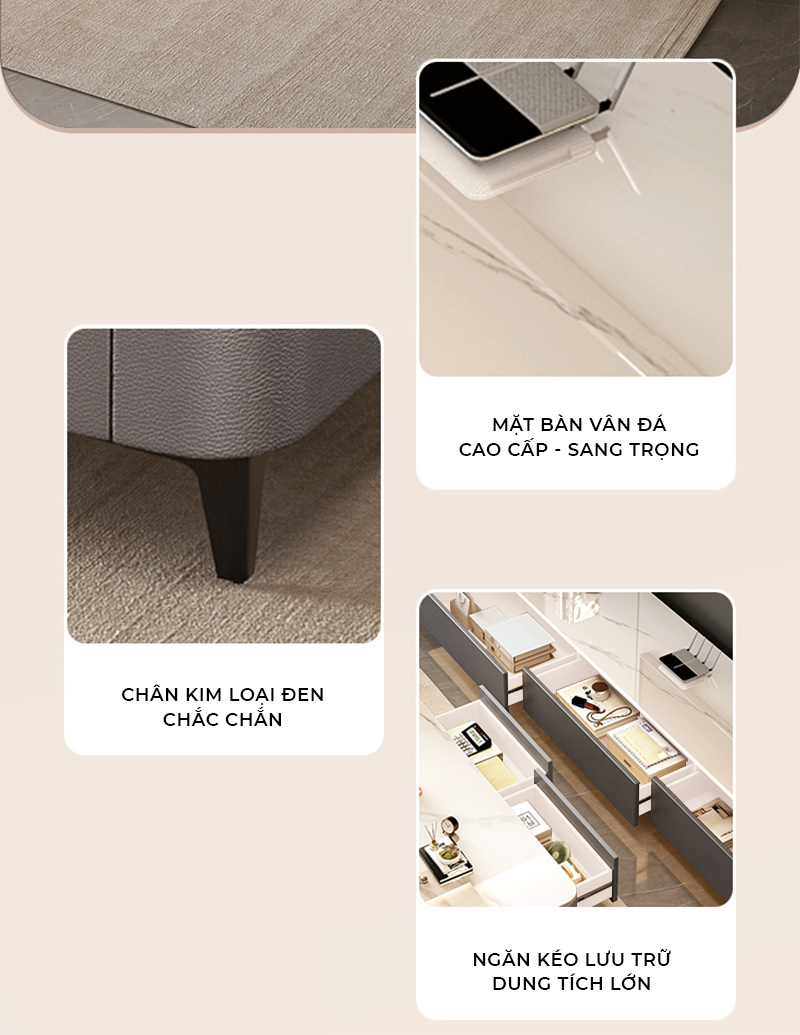 - Công năng: Là mẫu bàn sofa phòng khách sang trọng với thiết kế bọc da quanh viền và mặt bàn màu vân đá hiện đại