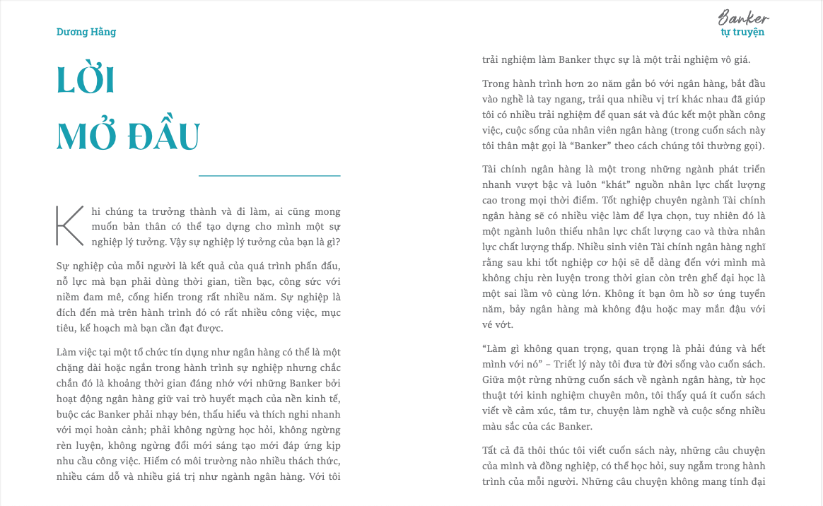 • Đó là những góc khuất dễ vô tình bỏ qua nhưng lại có nhiều điều đáng suy ngẫm. Đọc Banker tự truyện để thấy mình trong đó, để biết thêm những tình huống mà mỗi Banker gặp hằng ngày, để hiểu mình cần trang bị thêm những gì cho hành trình sự nghiệp của mình. TÁC GIẢ DƯƠNG HẰNG - NGƯỜI CÓ TẦM ẢNH HƯỞNG LỚN TRONG GIỚI NGÂN HÀNG  Tác giả Dương Hằng có 22 năm trong lĩnh vực ngân hàng. Chị từng giữ các chức vụ: Giám đốc Techcombank Đà Nẵng hàm Phó chủ tịch Điều hành, Giám đốc Vùng Khách hàng Doanh nghiệp VIB, Phó tổng Giám đốc SeABank. Chị sinh ra và lớn lên ở Hà Nội nhưng làm việc chủ yếu tại Đà Nẵng. “Chị Hằng Techcombank” hay “Chị Hằng Ngân hàng” là thương hiệu được nhiều người biết đến và quý trọng. Thời điểm nghỉ hưu chị chuyển sang một lĩnh vực mới, trở thành một Performance Coach với thương hiệu mới “Coach Dương Hằng” với mong muốn giúp các Leader/Manager và mọi người có cuộc sống thành công và hạnh phúc, trọn vẹn và ý nghĩa hơn.