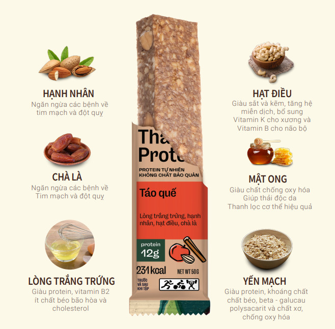 Mua tại TiktokThương hiệu 365 Begin Xuất xứ thương hiệu Việt Nam Xuất xứ Việt Nam SKU 8 938528 147124 Thành phần Hạt điều, mật ong, hạnh nhân, bột lòng trắng trứng, yến mạch, mạch nha, chà là, chât xơ, bột quế, dầu thực vật, lecithin [322(i)], hương tổng hợp (táo, chuối), muối, tocopherol (307b). Hạn sử dụng 6 tháng kể từ ngày sản xuất Hướng dẫn sử dụng Xé bao bì dùng ngay trước và sau vận động. Bạn có thể cắt nhỏ thành từng miếng hoặc dùng thay thế bữa ăn cho những lúc bận rộn. Hướng dẫn bảo quản Để nơi khô ráo, thoáng mát, tránh ánh năng mặt trời Trọng lượng 50g Đơn giản mà mạnh mẽ. Khoác lên mình vẻ ngoài hồng phấn cổ điển của Táo Quế cùng sự cách tân cho cuộc sống hiện đại ngày nay, là giải pháp nhanh gọn để bạn nạp năng lượng cho những cuộc chinh phục mới. · Được làm từ 100% nguyên liệu, vị ngọt từ mật ong và không chứa chất bảo quản. Banu chứa một lượng lớn calories và đặc biệt là PROTEIN TỰ NHIÊN sẵn sàng cho cơ thể vận động cả ngày dài mà không đuối sức.. Môt thanh hạt protein Banu có hàm lượng dinh dưỡng từ ngũ cốc và hạt, bao gồm: năng lượng sạch, chất đạm, hàm lượng chất xơ, chất béo tốt, canxi và khoáng chất. Banu được tin dùng thay thế cho những bữa ăn hay dùng cho trước và sau vận động, cùng “mổ xẻ” thanh Protein này xem bên trong có gì nhé.
