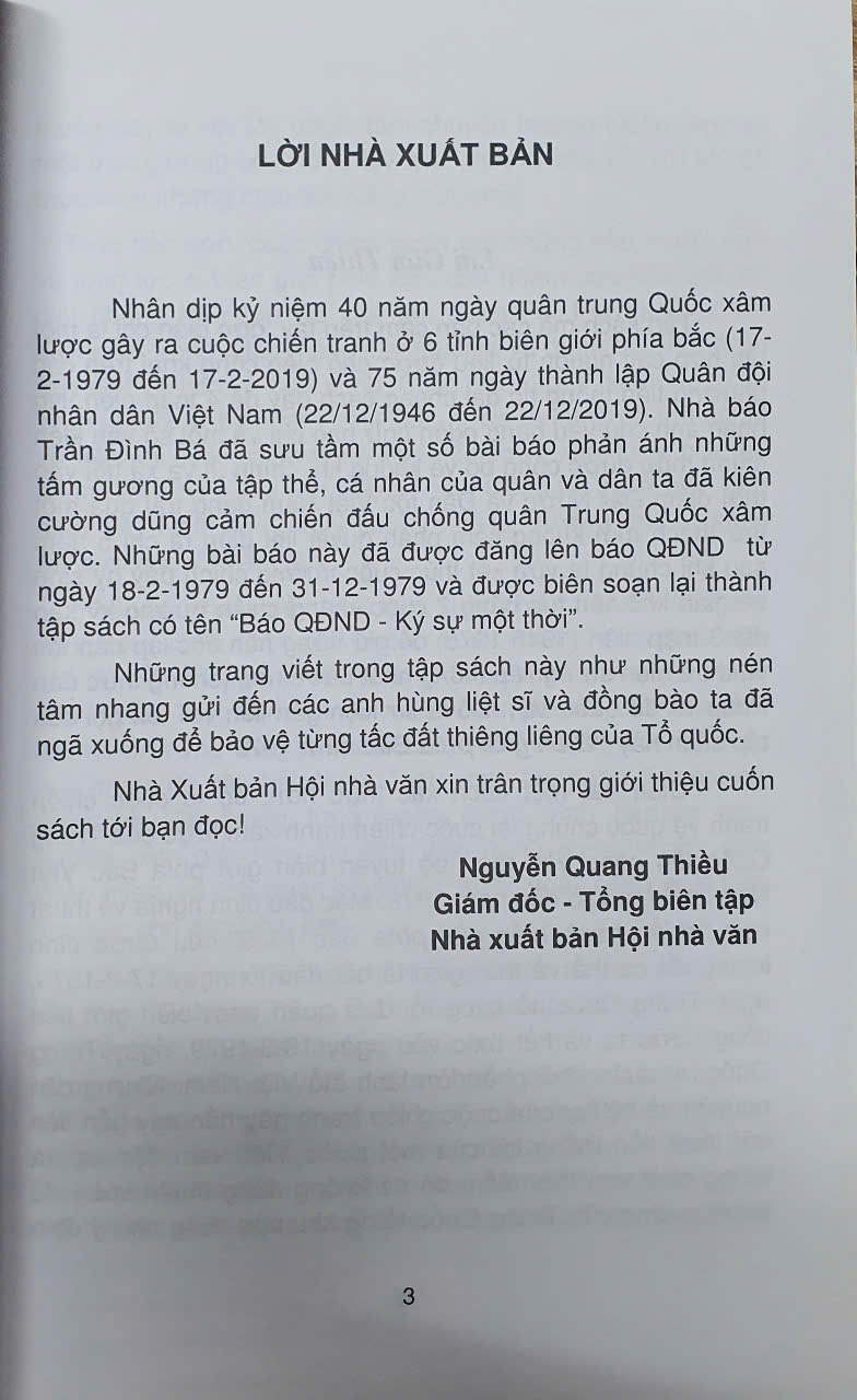 Nhân kỷ niệm 40 năm ngày quân Trung Quốc xâm lược gây ra cuộc chiến tranh ở 6 tỉnh biên giới phía Bắc (17/2/1979 – 17/2/2019) và 75 năm ngày thành lập Quân đội Nhân dân Việt Nam (22/12/1944 – 22/12/2019), nhà báo Trần Đình Bá đã sưu tầm một số bài báo phản ánh những tấm gương của tập thể, cá nhân của quân và dân ta đã kiên cường dũng cảm chiến đấu chống quân Trung Quốc xâm lược. Những bài báo này đã được đăng trên báo QĐND từ ngày 18/2/1979 đến ngày 31/12/1979 và được biên soạn thành tập sách có tên gọi: “Báo QĐND – Ký sự một thời 1979” do NXB Hội Nhà văn xuất bản tháng 4/2019. Những trang viết trong tập sách như những nén tâm nhang gửi đến các anh hùng liệt sĩ và đồng bào ta đã ngã xuống để bảo vệ từng tấc đất thiêng liêng của Tổ quốc. Cuốn sách sau khi ra mắt đã nhận được nhiều phản hồi từ độc giả. Trong đó có phản hồi về một số sai sót xảy ra do sơ suất trong khâu đánh máy và sửa bản in như trang 3 từ dòng thứ nhất đến dòng thứ tư (trên xuống), xin đọc là: “Nhân kỷ niệm 40 năm ngày quân Trung Quốc xâm lược gây ra cuộc chiến tranh ở 6 tỉnh biên giới phía Bắc (17/2/1979 – 17/2/2019). Và 75 năm ngày thành lập Quân đội Nhân dân Việt Nam (22/12/1944 – 22/12/2019)”. Tác giả xin thành thật cáo lỗi cùng bạn đọc và xin chân thành xin lỗi Nhà thơ Nguyễn Quang Thiều, Giám đốc – Tổng biên tập Nhà xuất bản Hội Nhà văn, cùng bạn đọc. Trong cuốn sách này có sử dụng nhiều bài của nhiều tác giả đã đăng trên Báo QĐND năm 1979. Nhưng do không biết được địa chỉ của các tác giả, nên chưa gửi sách biếu, hoặc nhuận bút đến các tác giả. Tác giả Trần Đình Bá xin chân thành xin lỗi.