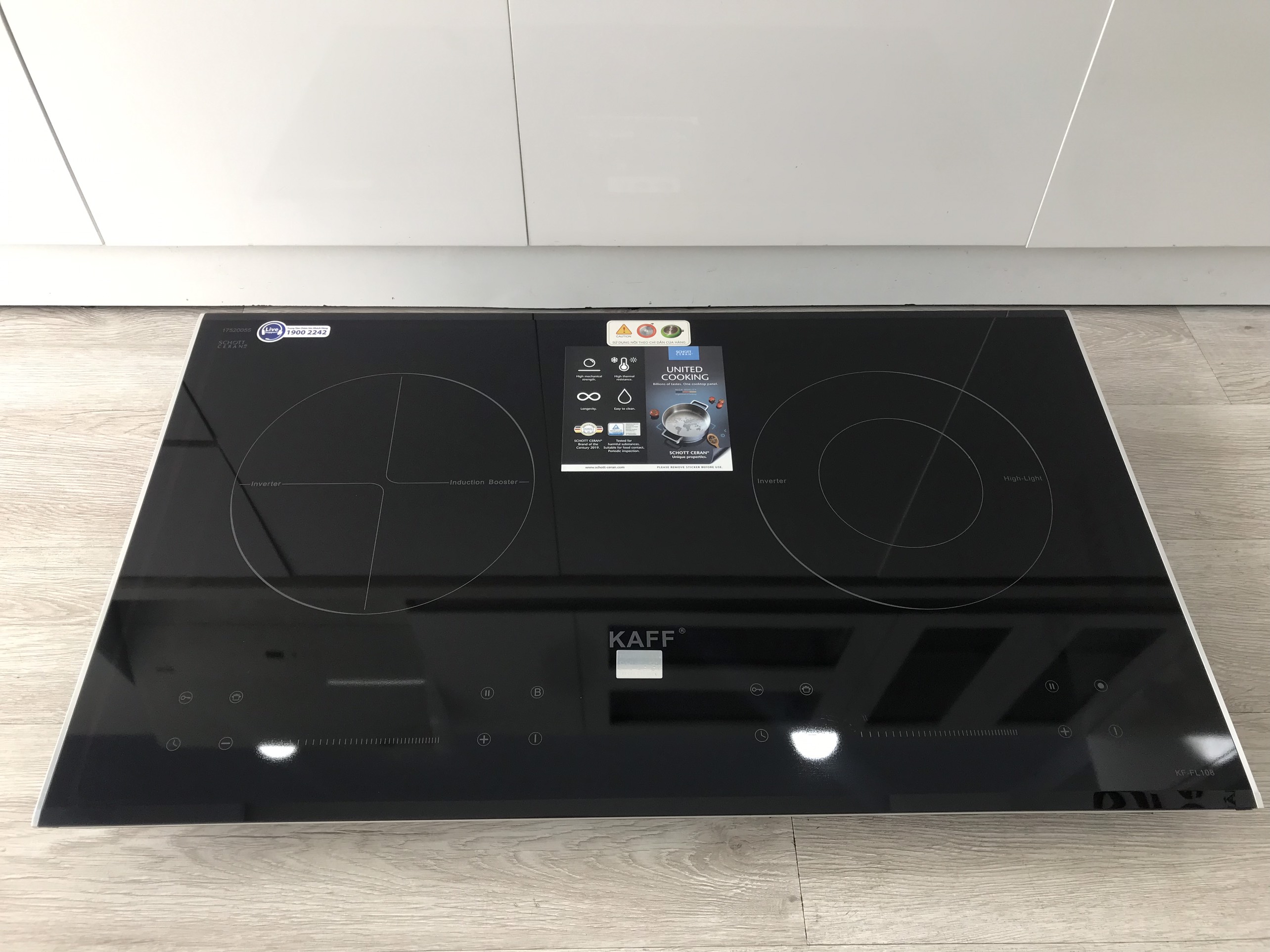BẾP ĐIỆN TỪ KAFF KF-FL108 | NHẬP KHẨU NGUYÊN CHIẾC TỪ CHLB ĐỨC | THIẾT KẾ SANG TRỌNG | HỆ ĐIỀU KHIỂN CẢM ỨNG SLIDER CONTROL LINH HOẠT | AN TOÀN, BỀN BỈ VÀ TIẾT KIỆM ĐIỆN NĂNG   Bếp điện từ Kaff KF-FL108 sử dụng mặt kính Schott Ceran sản xuất tại Đức, mặt kính được làm từ chất liệu gốm thủy tinh có khả năng chịu nhiệt lên đến 1000°C, kháng sốc 750°C. Bề mặt kính chịu nóng lạnh cũng như sự thay đổi đột ngột của nhiệt độ. Độ giãn nở vì nhiệt thấp nên bếp hoạt động rất hiệu quả và cách nhiệt. Mặt bếp tản nhiệt nhanh và được cách điện an toàn với các linh kiện điện tử bên trong thân. Bạn có thể yên tâm sử dụng mà không lo bị bỏng hay điện giật.   Đây là mặt kính chuyên dụng dành cho bếp điện từ, là một loại kính có chất lượng cao, rất cứng, bền và có nhiều đặc điểm nổi trội như: khả năng chịu nhiệt, khả năng chống trầy xước và chống va đập Mặt kính gồm các thấu kính hội tụ, truyền nhiệt từ bếp lên đáy nồi theo phương thẳng đứng, không thất thoát nhiệt ra môi trường. Mặt kính màu xám liền nguyên khối, an toàn, thẩm mỹ và tiện trong việc vệ sinh, lau chùi.   Bếp điện từ Kaff KF-FL108 gồm 2 vùng nấu với tổng công suất 4200W, vùng nấu từ trái có công suất 2200W khi kích hoạt tính năng nấu nhanh Booster công suất lên tới 3500W, vùng nấu hồng ngoại phải sử dụng mâm nhiệt E.G.O Hi-Light với 02 vòng nhiệt có công suất tối đa 2000W. Chỉ trong chốc lát sau khi kích hoạt tính năng này, nhiệt lượng trên vùng nấu từ tăng lên công suất tương đương với mức nhiệt lượng lớn nhất. Do đó, các món ăn được nấu chín nhanh hơn, tiết kiệm thời gian vào bếp cho chị em nội trợ. Chức năng Booster nấu siêu nhanh, tuy nhiên thời gian tối đa mặc định dùng chức năng này là 10 phút / lần tránh quá tải.   Bếp điện từ Kaff KF-FL108 với công nghệ Inverter thông minh vượt trội giúp làm giảm lượng tiêu thụ điện của các sản phẩm có sử dụng lõi từ của bếp từ. Ngoài ra công nghệ Inverter còn giúp bếp từ điều chỉnh mức công suất phù hợp để không làm tiêu thụ nhiều điện năng. Bếp điện từ Kaff KF-FL108 với cảm biến thông minh sẽ cố định công suất tiêu thụ điện khi đun nấu, không bật tắt liên tục như các bếp từ thông thường khác (tự động điều chỉnh liên tục để đảm bảo mức nhiệt tương đương bằng với con số hiển thị trên bàn điều khiển).   Bạn có thể tận dụng các loại xoong, nồi vì bếp điện không kén nồi, phù hợp với nhiều kích cỡ. Ưu điểm của bếp điện hơn hẳn các sản phẩm khác là có thể nướng trực tiếp lên bề mặt. Nướng thịt, rau củ, hải sản thơm ngon. Bạn nên vệ sinh sạch sẽ mặt bếp sau khi sử dụng. Hoạt động của bếp điện là truyền nhiệt lên mặt kính rồi mới lên đáy nồi nên mặt kính bếp rất nóng. Sau khi nấu, bạn có thể tận dụng hâm nóng thức ăn trên bếp. Ngược lại với vùng điện, bếp từ chỉ hơi nóng vùng nấu. Hiệu suất nấu lên tới 90%. Chức năng nhận diện vùng nấu chỉ sinh nhiệt vùng đáy nồi, tránh nồi thất thoát nhiệt ra ngoài.   Bếp điện từ Kaff KF-FL108 được tích hợp chức năng tự nhận diện vùng nấu, khi ta đặt nồi lên 1 trong 2 vùng nấu sau đó ấn nút khởi động bếp sau thời gian 1-2 giây bếp sẽ tự động tìm vùng nấu đã có nồi, ta chỉ việc điều chỉnh mức công suất to nhỏ theo ý muốn mà không phải thao tác chọn vùng nấu như bếp thông thường. Công nghệ Inverter được áp dụng trên Bếp điện từ Kaff KF-FL108 có khả năng phản ứng thay đổi công suất theo điều khiển ngay tức thì, khi người dùng điều chỉnh tăng giảm nhiệt độ đun nấu, bếp điều chỉnh thay đổi tức thì về mức nhiệt độ mong muốn.   Bếp điện từ Kaff KF-FL108 sử dụng bảng điều khiển cảm ứng dạng trượt Slider Control hiện đại với 9 cấp độ công suất nhiệt độ khác nhau, điều khiển dễ dàng bằng một ngón tay, mọi chương trình nấu đều được hiển thị qua đèn Led sắc nét để bạn điều chỉnh cho phù hợp với các món ăn. Bếp còn được trang bị thêm các chức năng nấu thông minh là: tính năng tạm dừng và hâm nóng.   Chức năng tạm dừng và ghi nhớ chương trình Pause & Recall: Tạm dừng bếp khi đang đun nấu, sau đó ta tiếp tục đun nấu trở lại bằng việc nhấn vào thanh trượt Slider hoặc phím Pause, bếp sẽ hoạt động trở lại đúng cài đặt trước đó khi được khởi chạy trở lại.   Chức năng ủ ấm “hâm nóng”: Với công nghệ biến tần Inverter vượt trội, Bếp điện từ Kaff KF-FL108 có khả năng ủ ấm ở nhiệt độ nhất định, chức năng ủ ấm được lập trình giữ mức nhiệt độ ổn định giúp chúng ta duy trì nhiệt cho thức ăn luôn nóng mà không bị nguội đi phải đun lại nhiều lần làm giảm chất dinh dưỡng trong thức ăn, đặc biệt về mùa đông thời tiết lạnh.   Phần thân vỏ của Bếp điện từ Kaff KF-FL108 sử dụng chất liệu thép chống rỉ. Đây là chất liệu