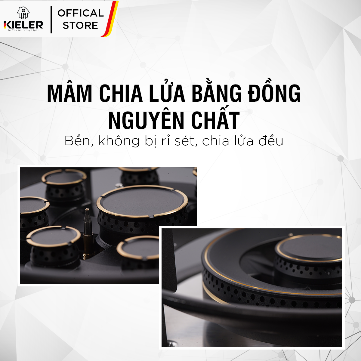 * Mặt kiếng cao cấp chịu lực, chịu nhiệt, thiết kế hoa văn sang trọng; - Thân bếp bằng inox, cao 100 mm; - Kiềng thép sơn tĩnh điện, có chắn gió; - Điếu loe