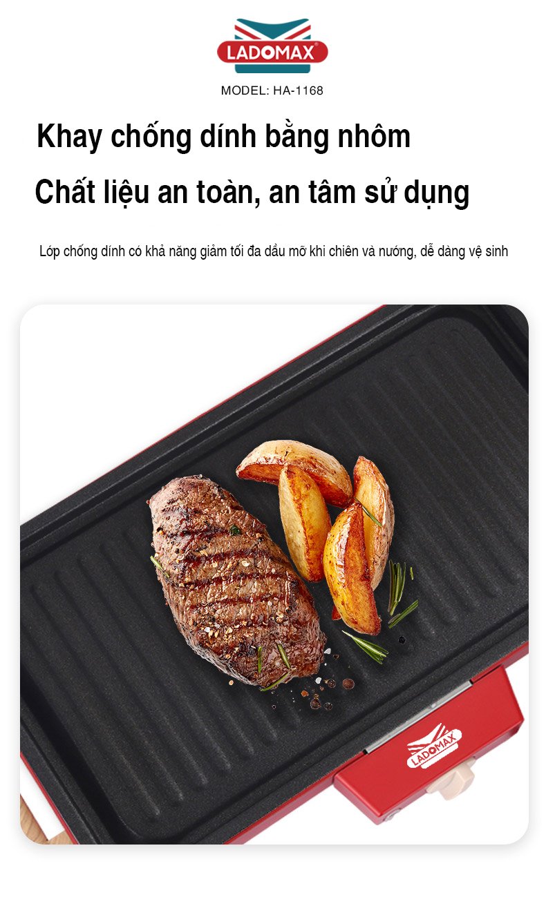 - Tên sản phẩm: BẾP NƯỚNG ĐIỆN ĐA NĂNG - Thương hiệu: LADOMAX - Model: HA-1186 - Điện áp: 220V - 50Hz - Công suất: 1500W - Cáu tạo :rời - Chất liệu Khay nướng:Nhôm