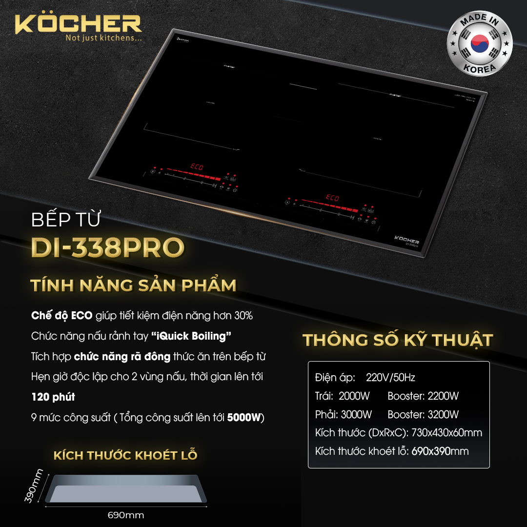BẾP TỪ ĐÔI KÖCHER DI-338PRO: VÙNG NẤU BIGZONE, NHIỀU TÍNH NĂNG THÔNG MINH