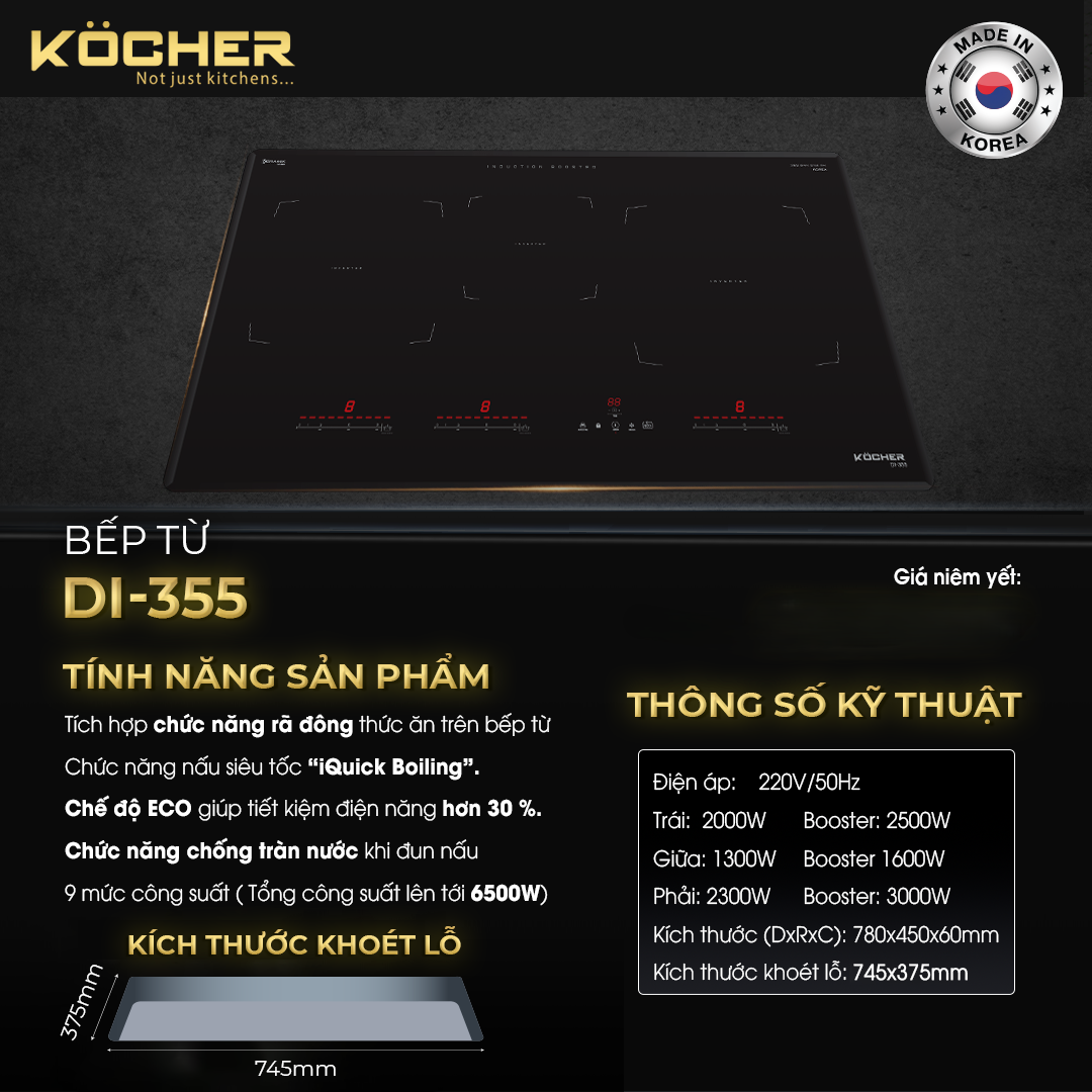 THÔNG SỐ KỸ THUẬT: – Điện áp 220V/50Hz – Trái 2000W/Booster 2300W – Phải 2000W/Booster 2300W – Kích thước (dài x rộng x cao): 750x430x60mm – Kích thước khoét lỗ: 695x395mm TÍNH NĂNG SẢN PHẨM: