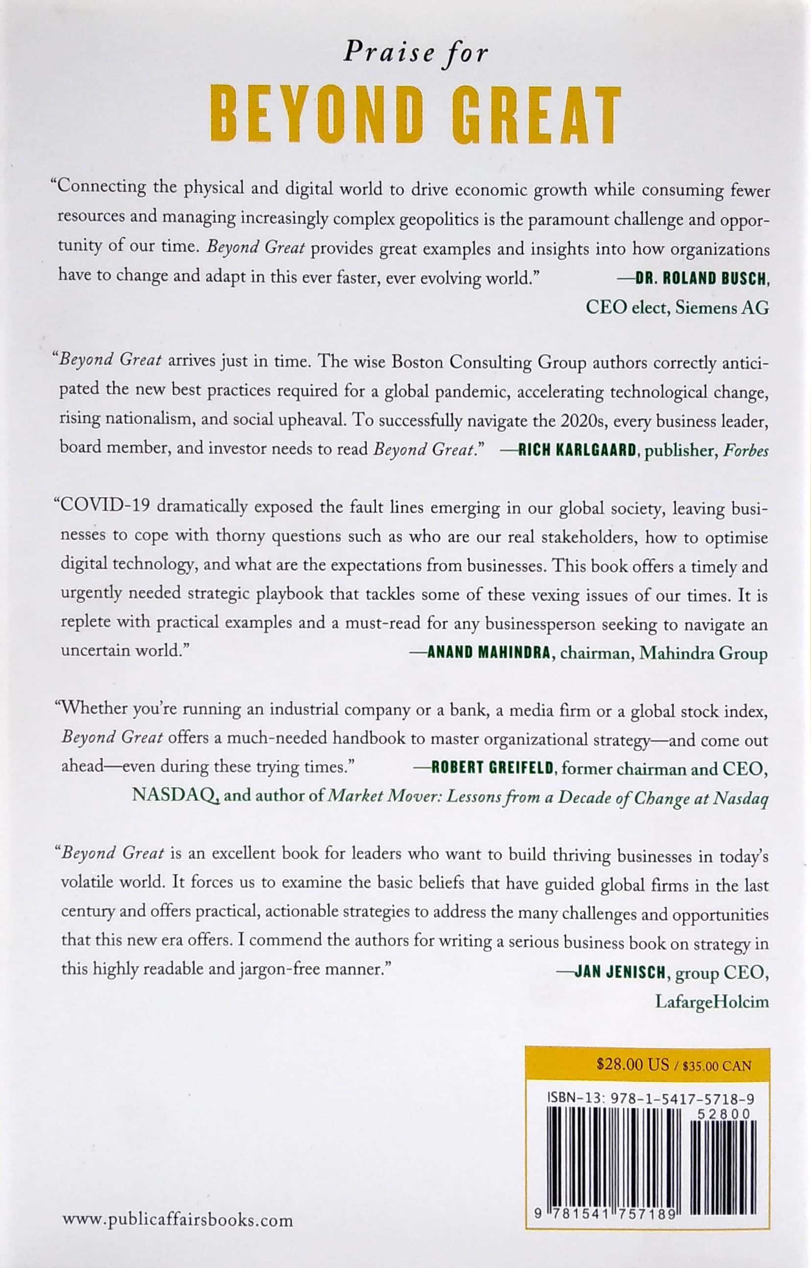 Beyond Great answers to two fundamental questions which face business leaders today in a world shaped by daunting and disruptive technological, economic, and social change. First, what is outstanding performance in this new volatile era? Second, how do we build competitive advantage in a world with new and often uncertain rules? Supported by years of research and hands-on consulting practice, this book presents a comprehensive framework for building a high performing, resilient, adaptive, and socially responsible global company.