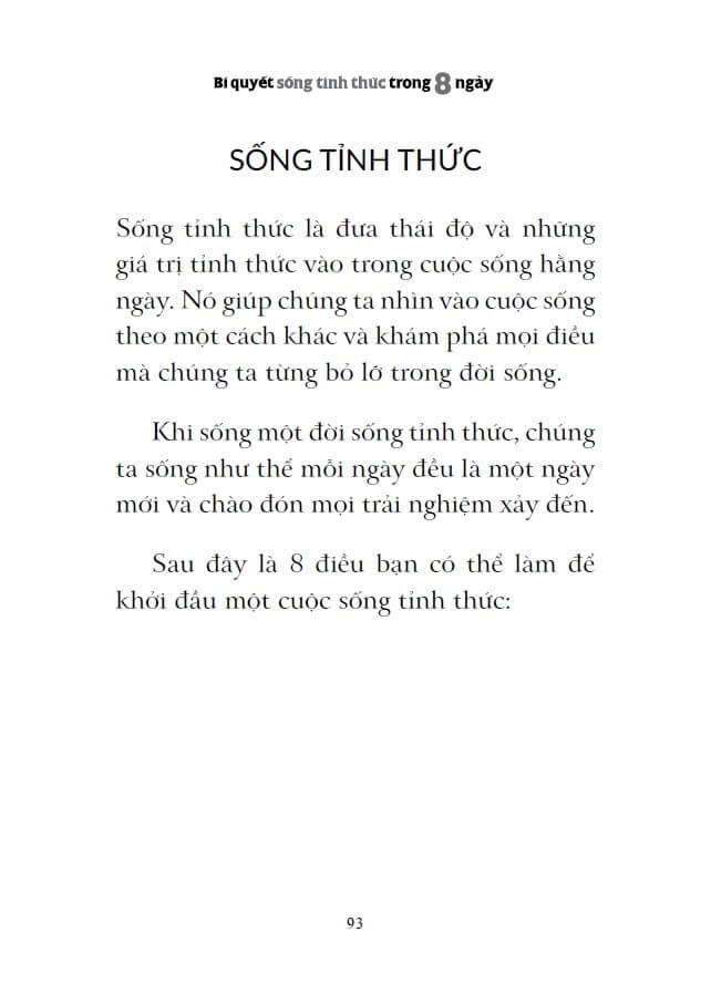 Nuôi dưỡng lòng tử tế và yêu thương. Thông qua những bài tập thực tế và câu chuyện truyền cảm hứng, cuốn sách hướng dẫn bạn cách áp dụng chánh niệm vào mọi khía cạnh cuộc sống: công việc, gia đình, hay ngay cả những hoạt động nhỏ như ăn uống hay đi bộ. Hành trình 8 ngày thực hành tỉnh thức Cuốn sách được chia thành 8 chương, mỗi chương là một ngày thực hành với các bài tập chánh niệm cụ thể: