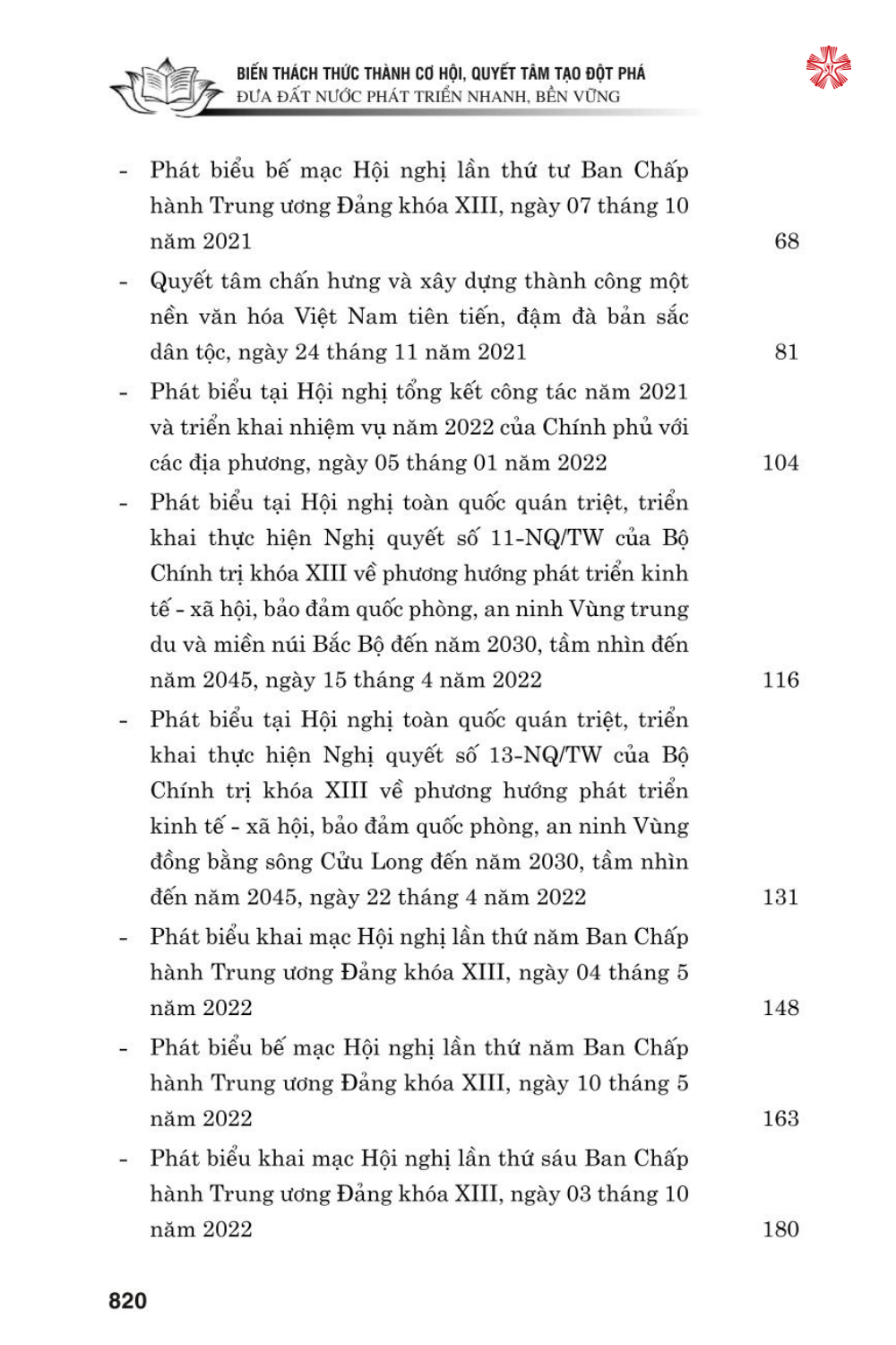 Cuốn sách “Biến thách thức thành cơ hội, quyết tâm tạo đột phá đưa đất nước phát triển nhanh, bền vững” tuyển chọn các bài phát biểu, bài viết, bài trả lời phỏng vấn, thư,