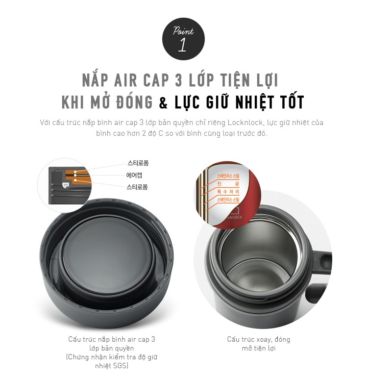 Đặc điểm nổi bật Bình giữ nhiệt LocknLock Easy Outdoor Vacuum Bottle LHC1485 có cấu tạo nắp 2 lớp với nắp bên trong làm bằng được thiết kế kín hơi, giúp chống rò rỉ nước