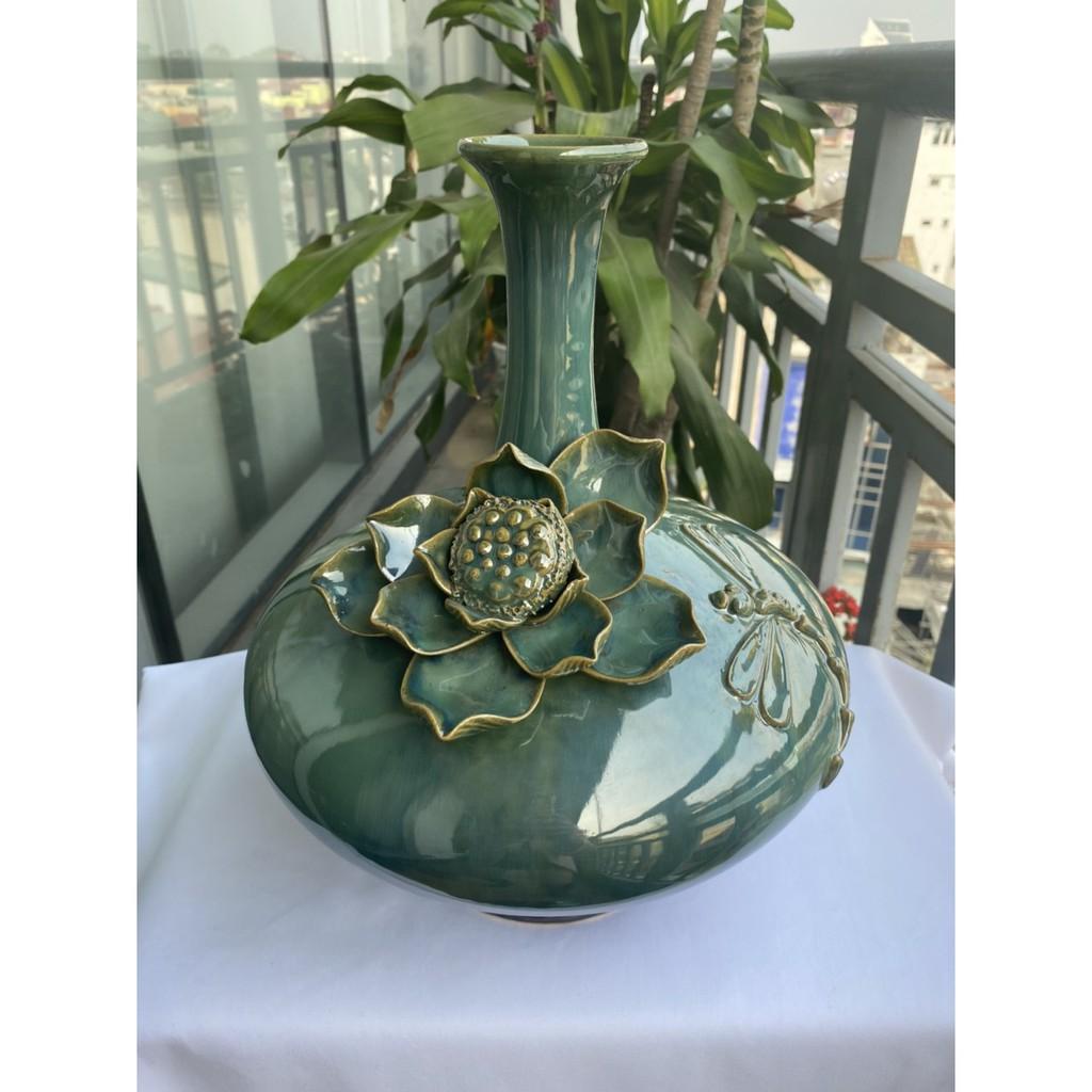 Mua tại TiktokBình hút tài lộc sứ Bát Tràng cao cấp, dáng cổ cao, bụng dẹt, men xanh hỏa biến với nước men căng bóng, sáng mịn cùng với họa tiết hoa sen đắp nổi cầu kỳ, được thực hiện thủ công 100% bởi bàn tay của các nghệ nhân lành nghề. Sản phẩm được trưng bày tại phòng khách, phòng làm việc, văn phòng, cửa hà vừa có tác dụng thu hút tài lộc đến cho chủ nhân vừa có tác dụng trưng các loại hoa theo mùa, giúp trang trí không gian trở nên ấn tượng, thu hút, mới mẻ, hấp dẫn. Bình hút tài lộc cao 35cm, miệng bình 6cm, vòng bụng bình 87cm