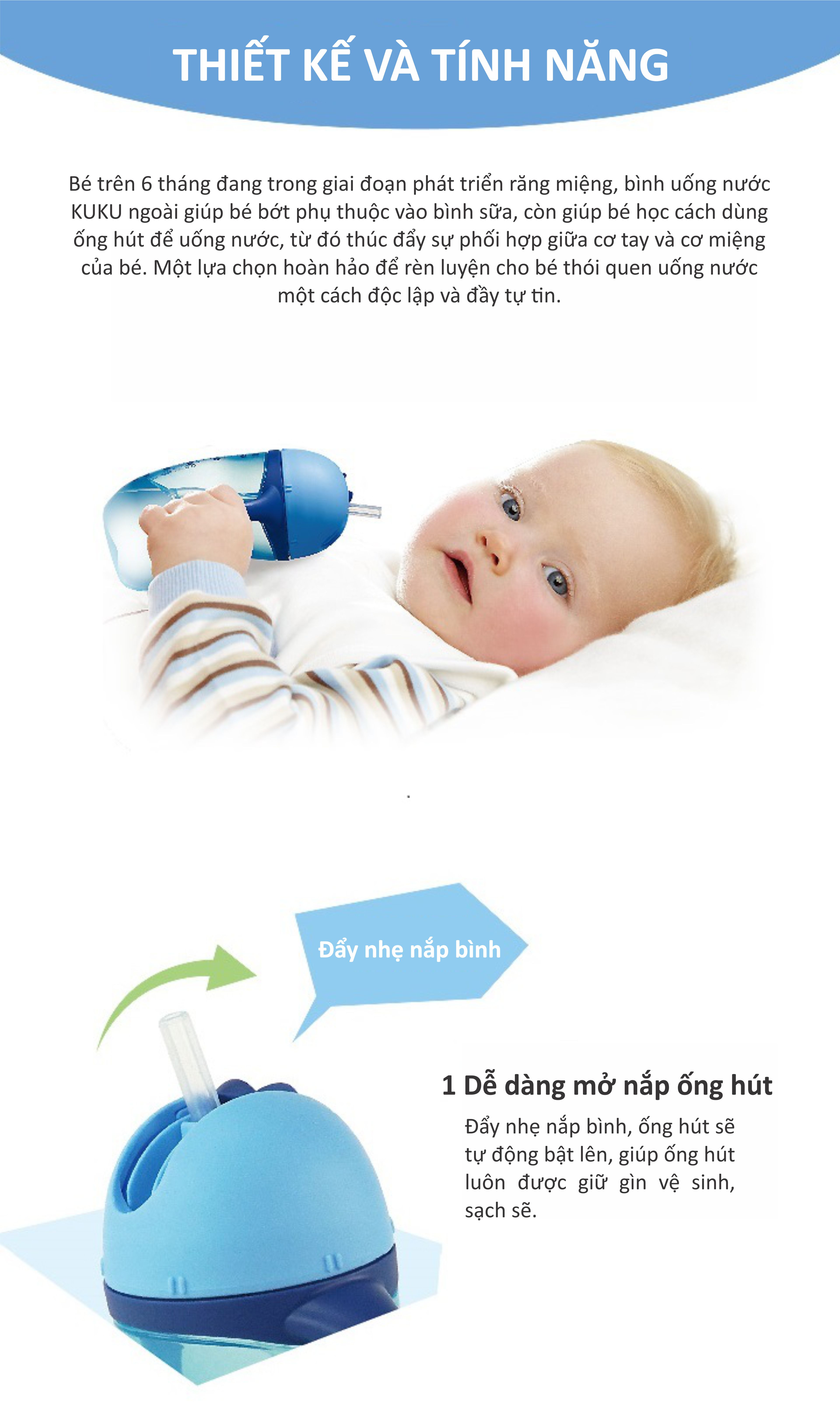• Sự lựa chọn hoàn hảo cho bước chuyển từ bình sữa sang bình nước Bé trên 6 tháng đang trong giai đoạn phát triển răng miệng, bình nước Kuku ngoài giúp bé bớt phụ thuộc vào bình sữa, còn giúp bé học cách dùng ống hút để uống nước, từ đó thúc đẩy sự phối hợp giữa cơ tay và cơ miệng của bé. Một lựa chọn hoàn hảo để rèn luyện cho bé thói quen uống nước một cách độc lập và đầy tự tin.