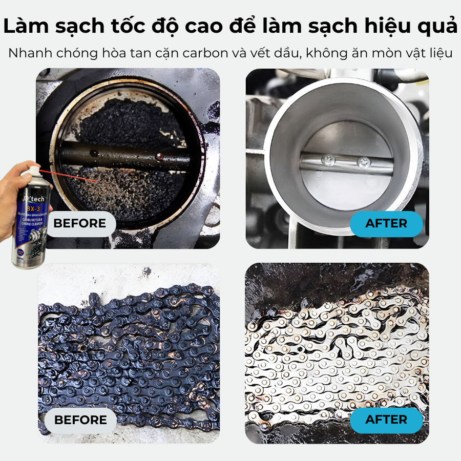 Làm sạch chế hòa khí dễ dàng: Chỉ cần xịt vào các vị trí cần vệ sinh, dung dịch sẽ giúp loại bỏ tạp chất, hỗ trợ quá trình vận hành trơn tru.