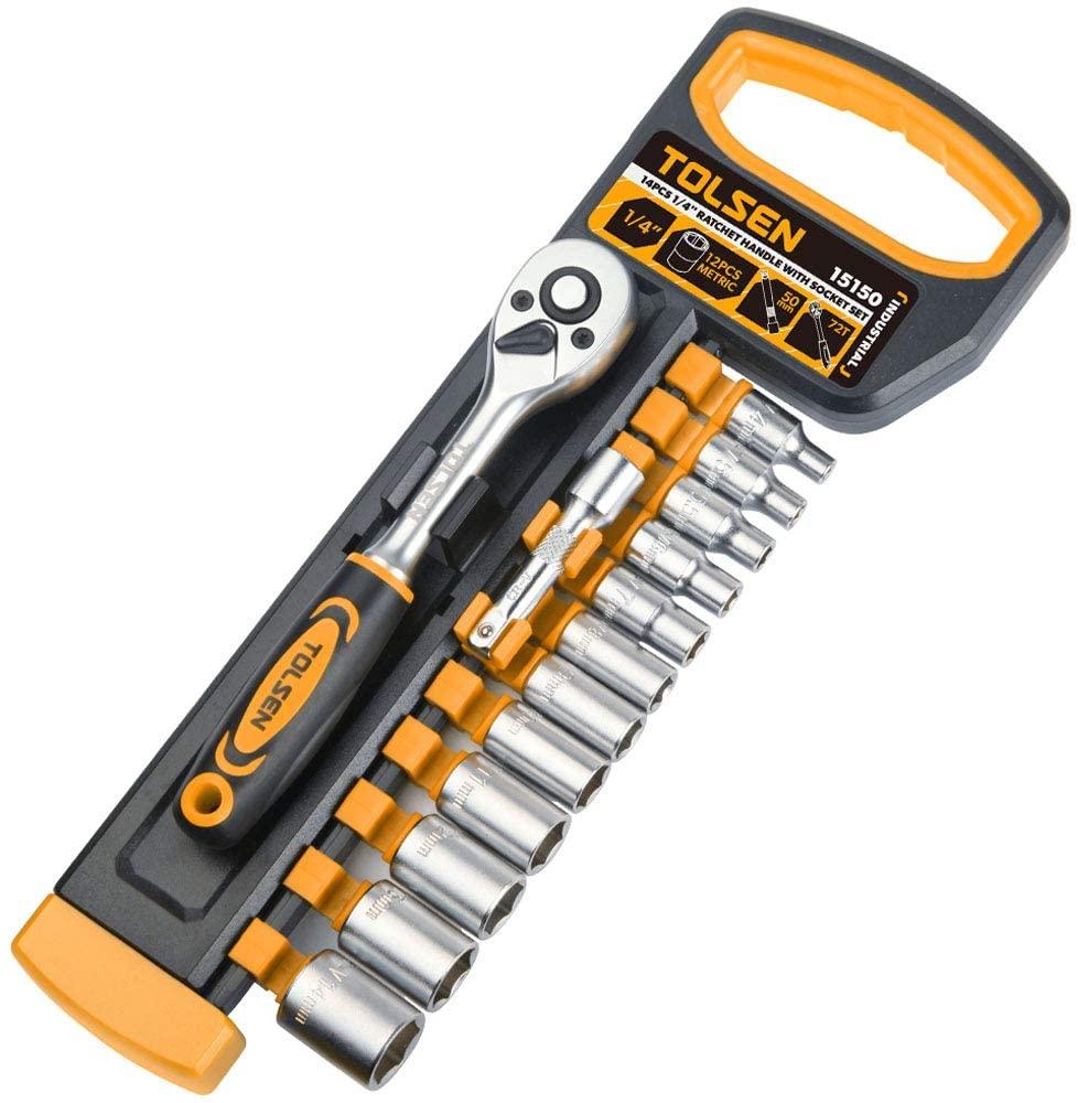 Thông số kĩ thuật - Mã sản phẩm: 15390 - Nhà sản xuất: TOLSEN - Xuất xứ: Trung Quốc - Bộ 13 đầu tuýp 1/4” DR Bao gồm: + 11 đầu tuýp 1/4" size: 5/32″,3/16″,7/32″,1/4″, 9/32″,5/16″,11/32″, 3/8″,